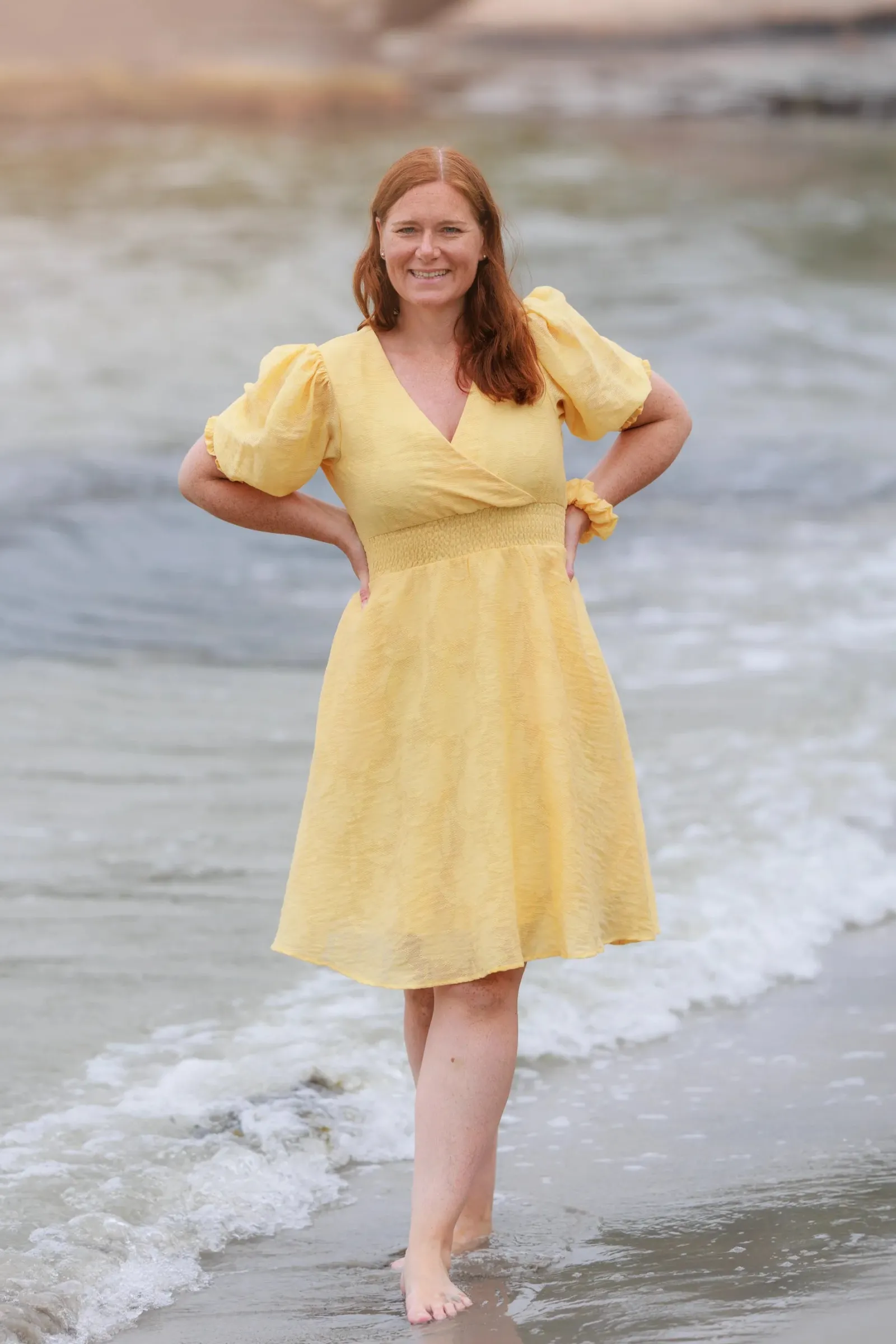 Belle Flower kjole i gul er en nydelig, kort sommerkjole. Stoffet har tekstur av blomster og oppleves luftig. Den har korte armer med puff og strikk. I midjen er det et behagelig strikk som gir en flatterende passform. På hver side av hoftene er det praktiske lommer. Passer like godt til hverdagen som til finere anledninger.