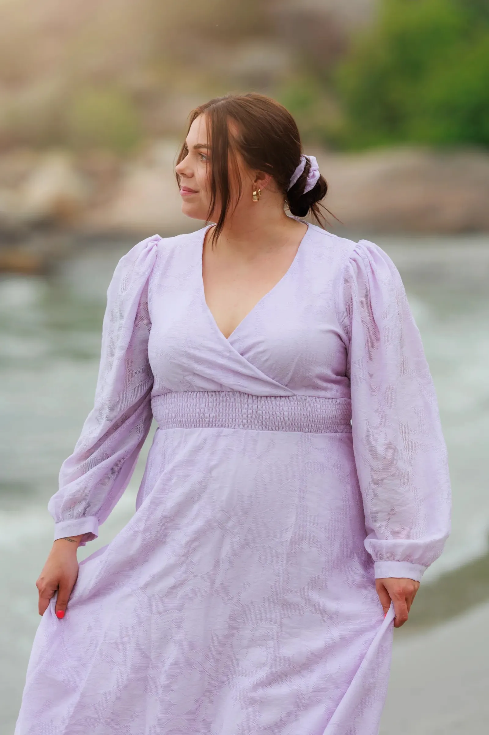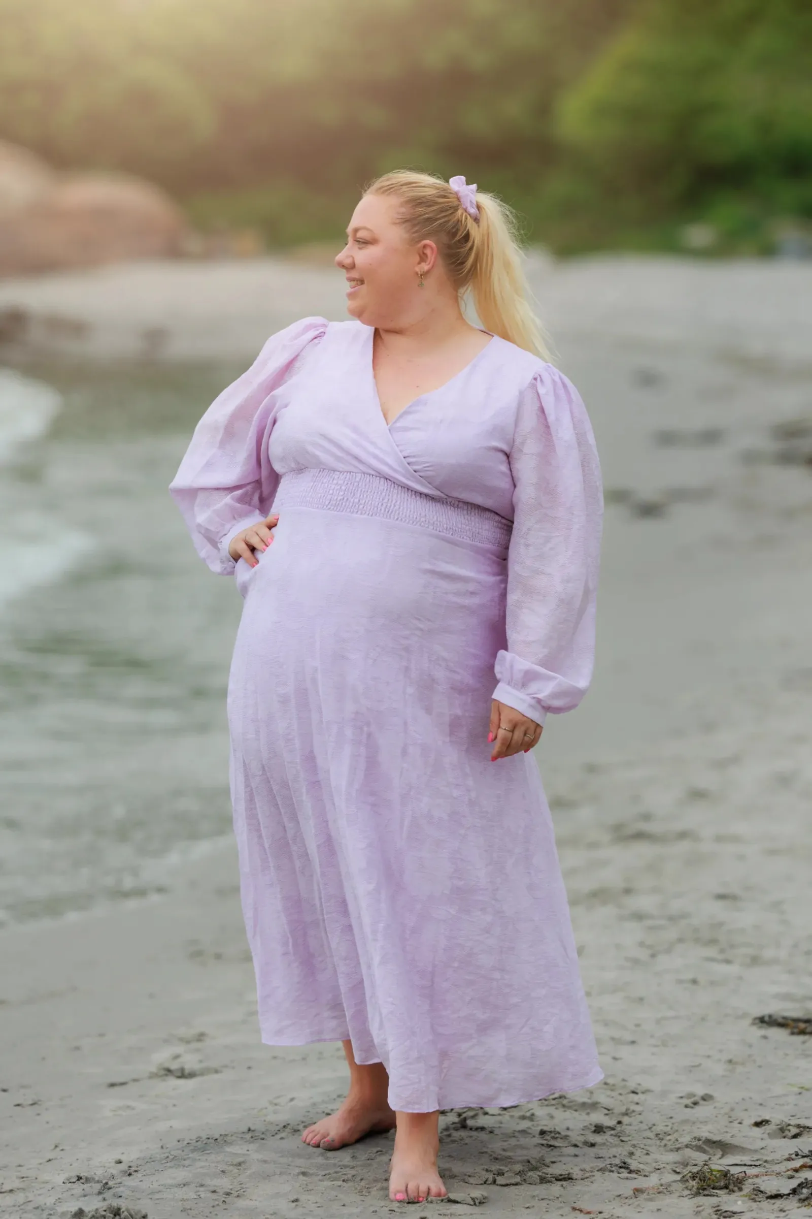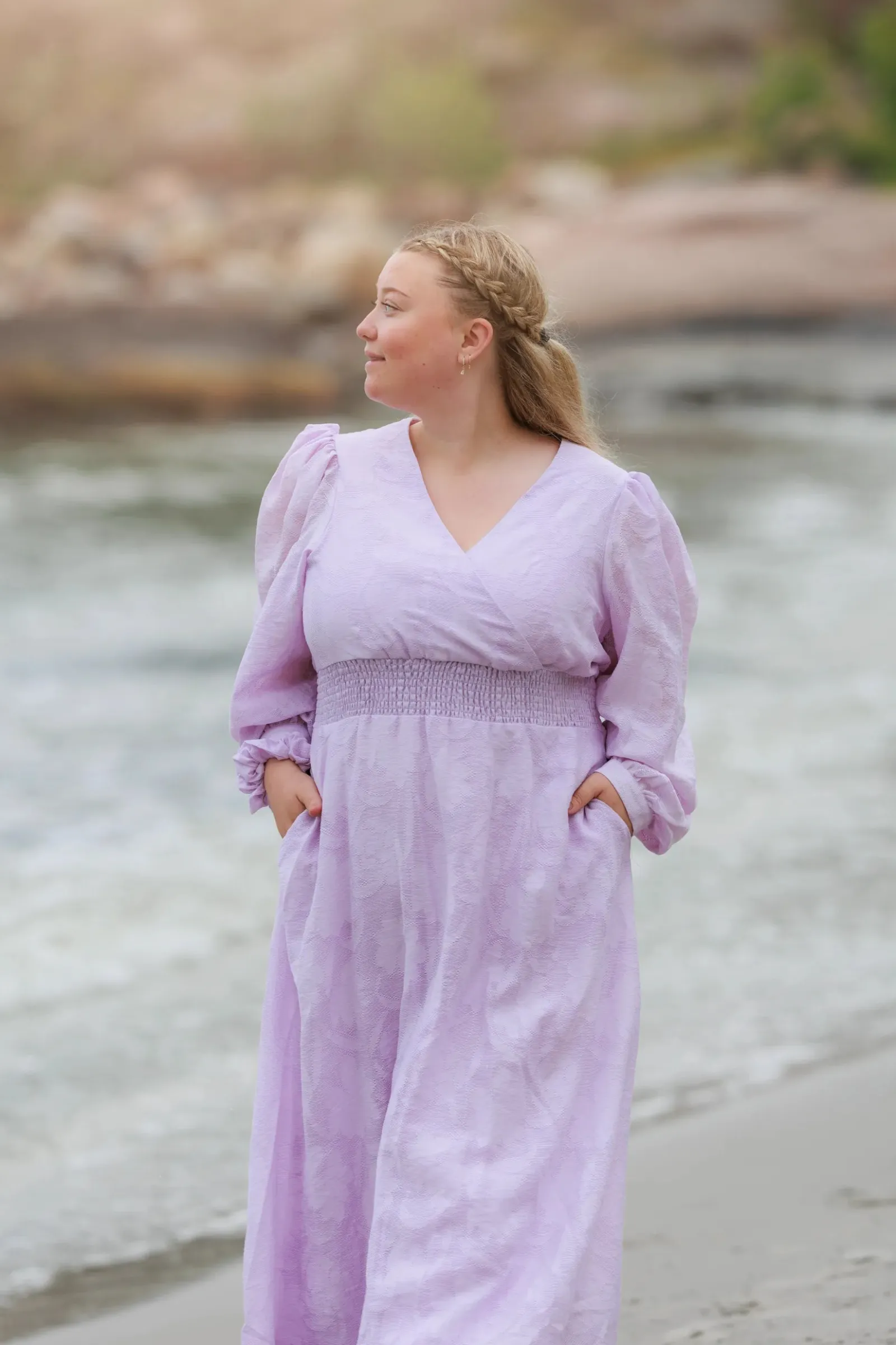 Belle Flower maxikjole i lilla er en nydelig, lang sommerkjole. Stoffet har tekstur av blomster og oppleves luftig. Den har lange armer med puff og strikk. I midjen er det et behagelig strikk som gir en flatterende passform. På hver side av hoftene er det praktiske lommer. Passer like godt til hverdagen som til finere anledninger.