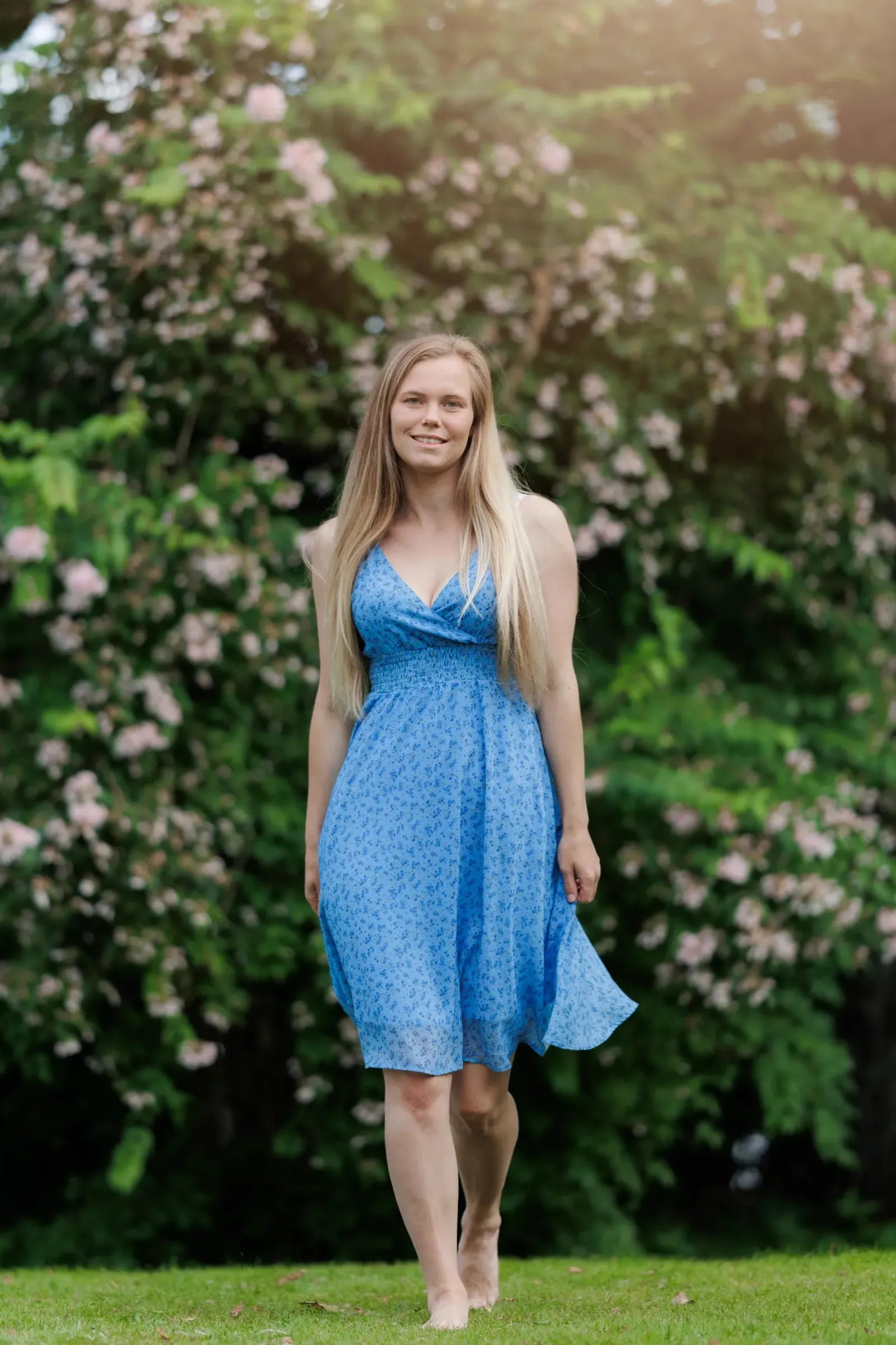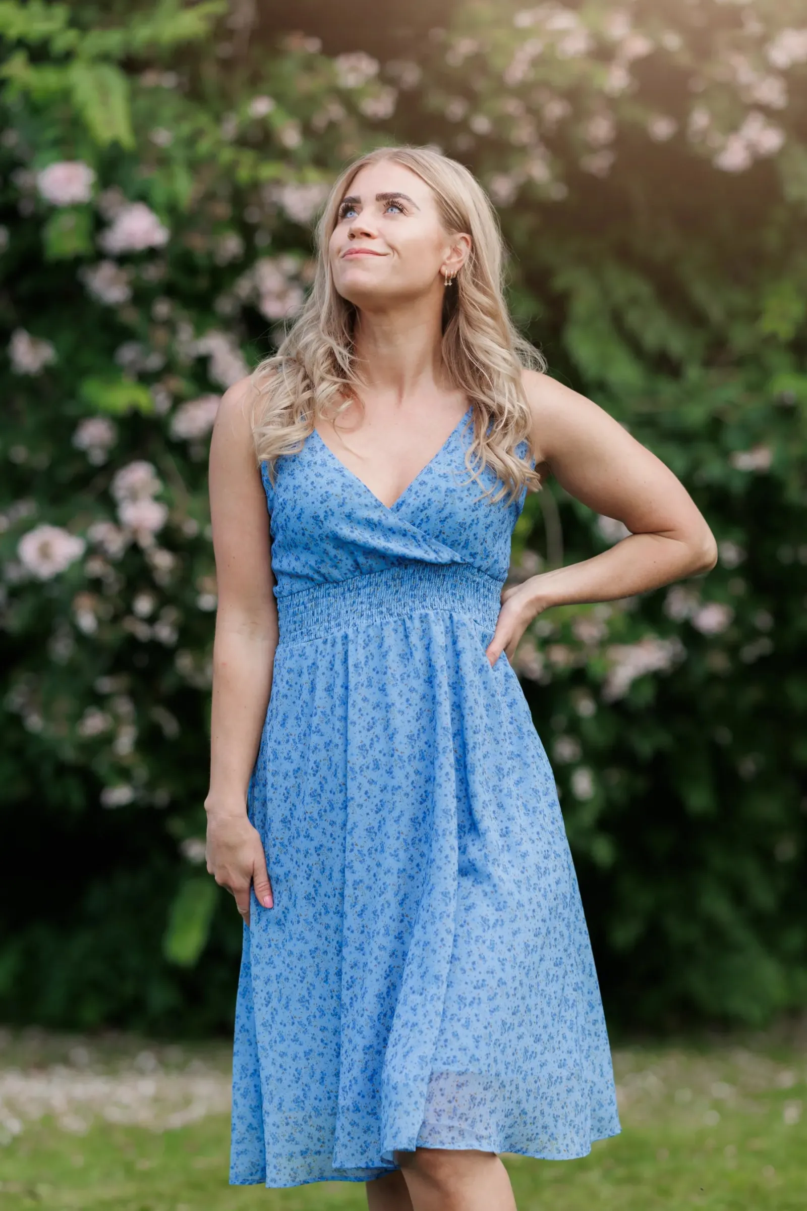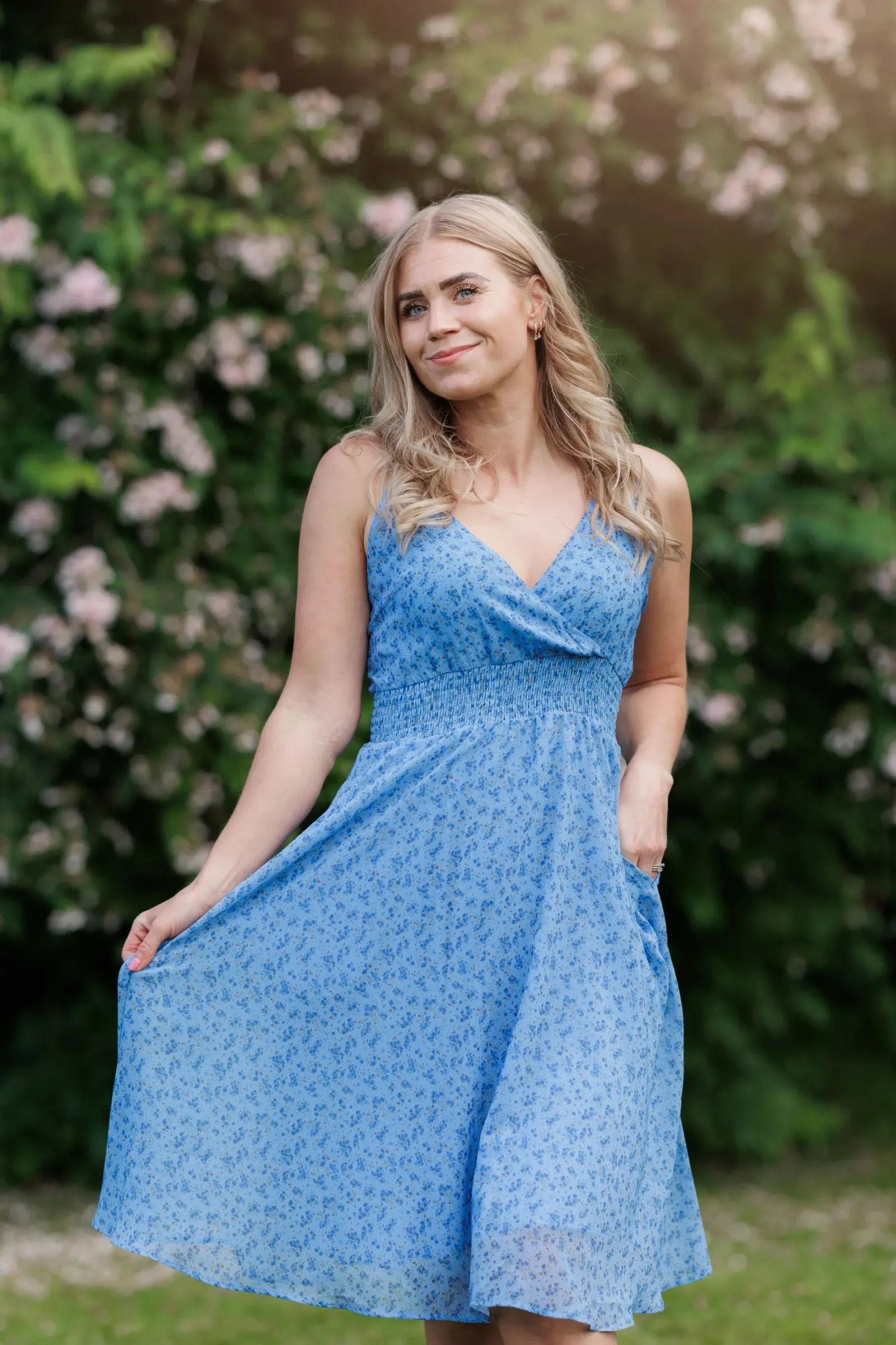 Belle med stropper i blå har et nydelig blomstermønster og er en lett, deilig kjole. Den legger seg så flatterende på og har et behagelig strikk i livet, i tillegg til lommer på hver side.