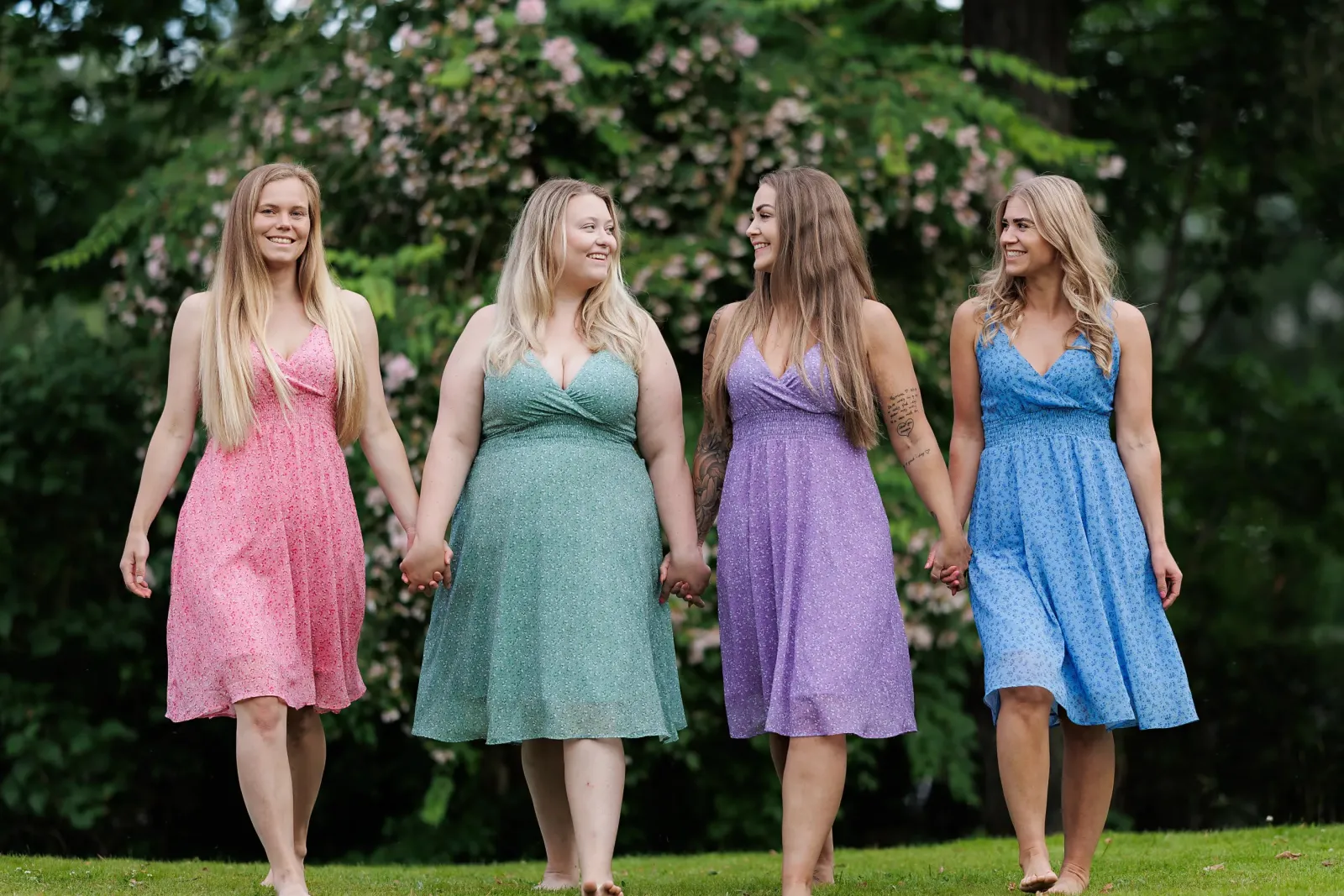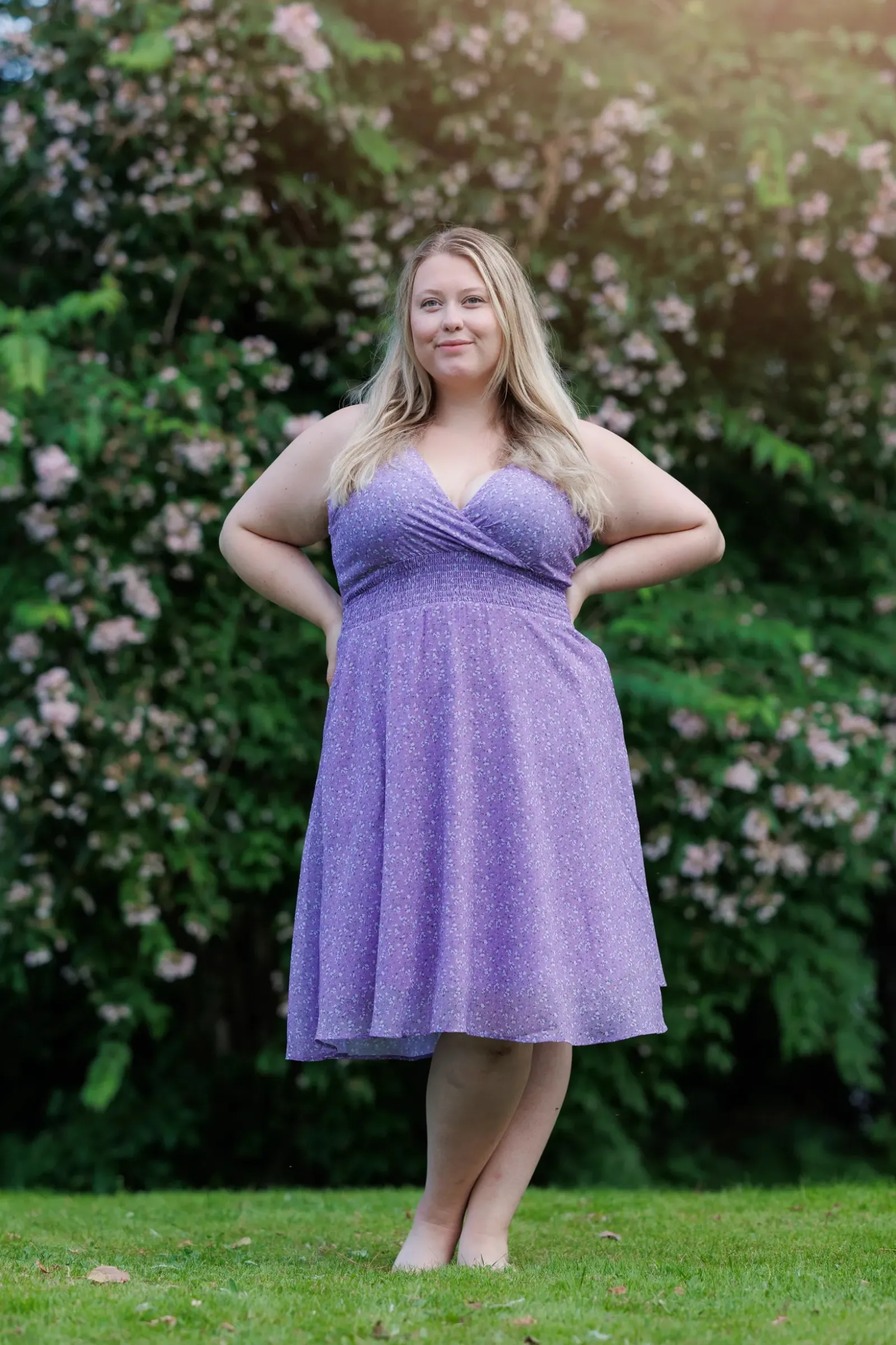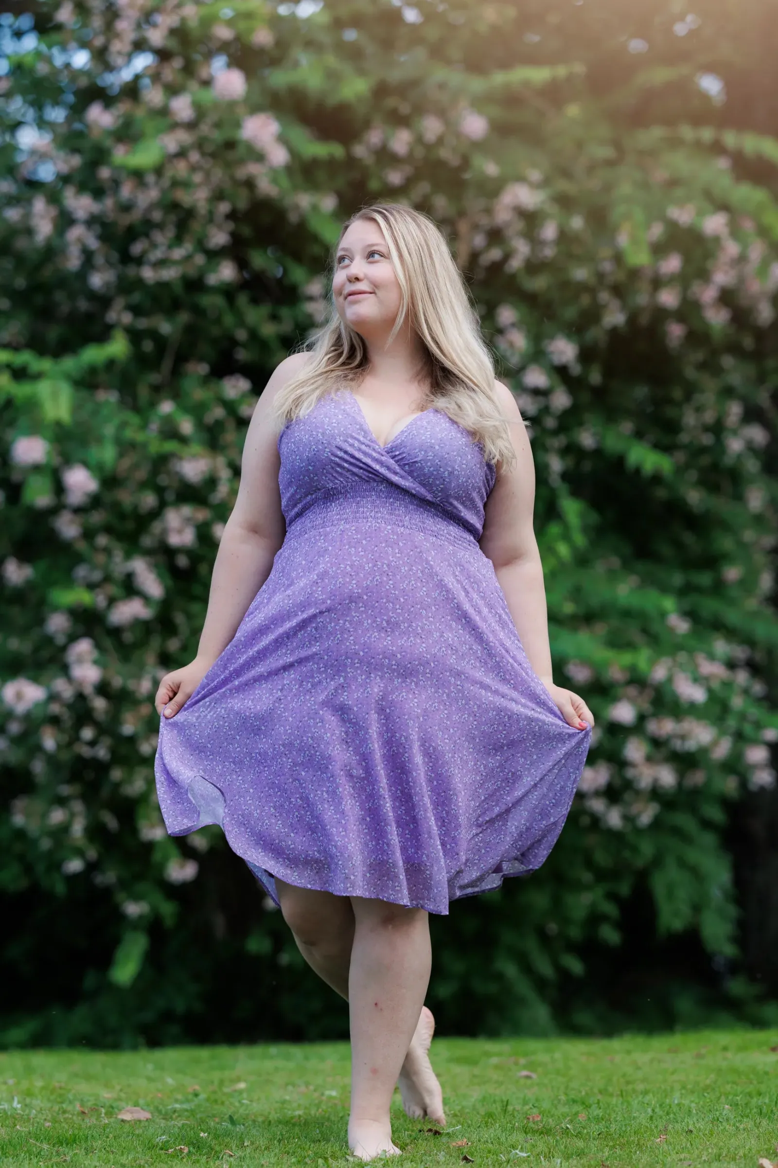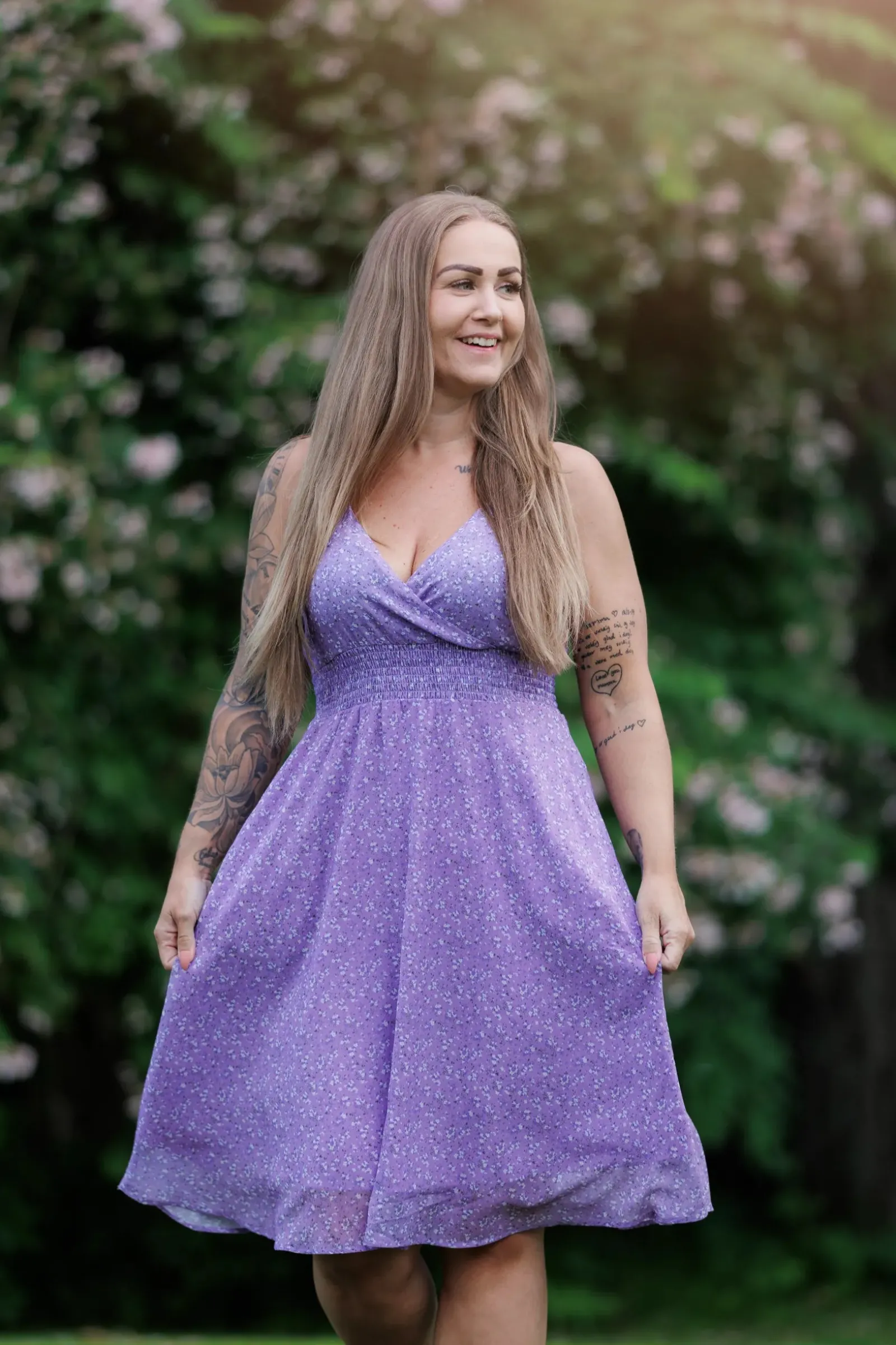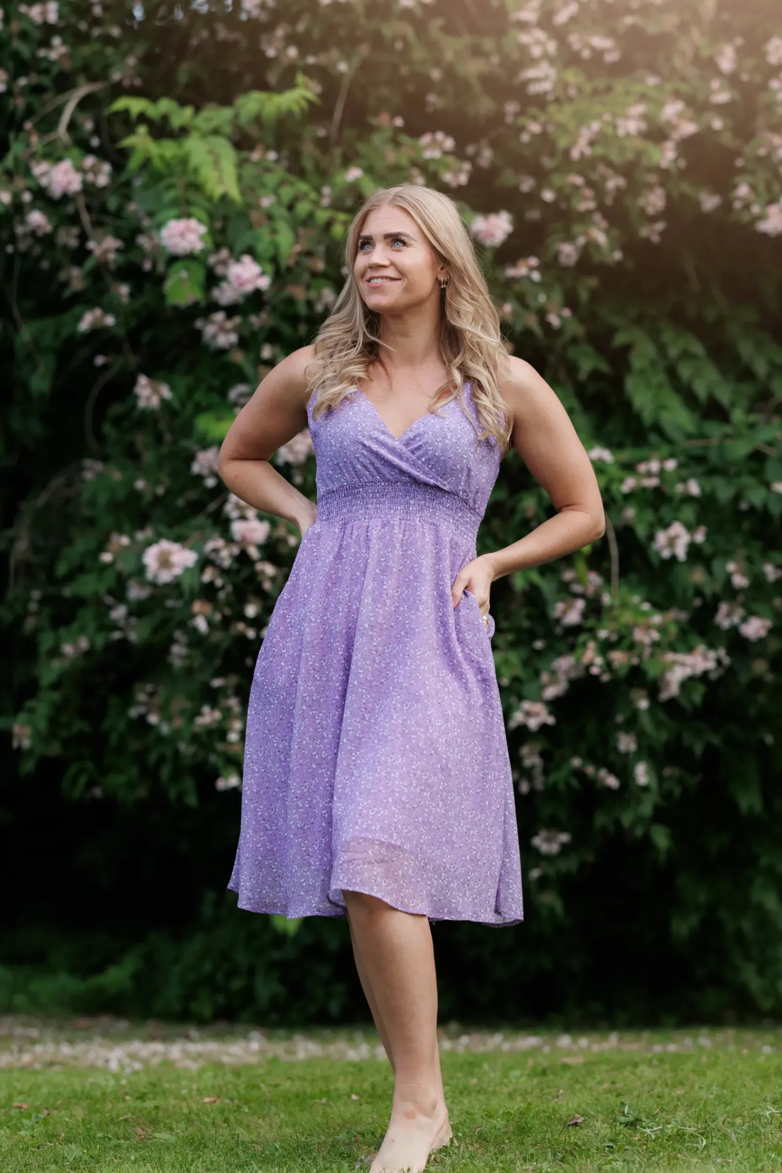 Belle med stropper i lilla har et nydelig blomstermønster og er en lett, deilig kjole. Den legger seg så flatterende på og har et behagelig strikk i livet, i tillegg til lommer på hver side.