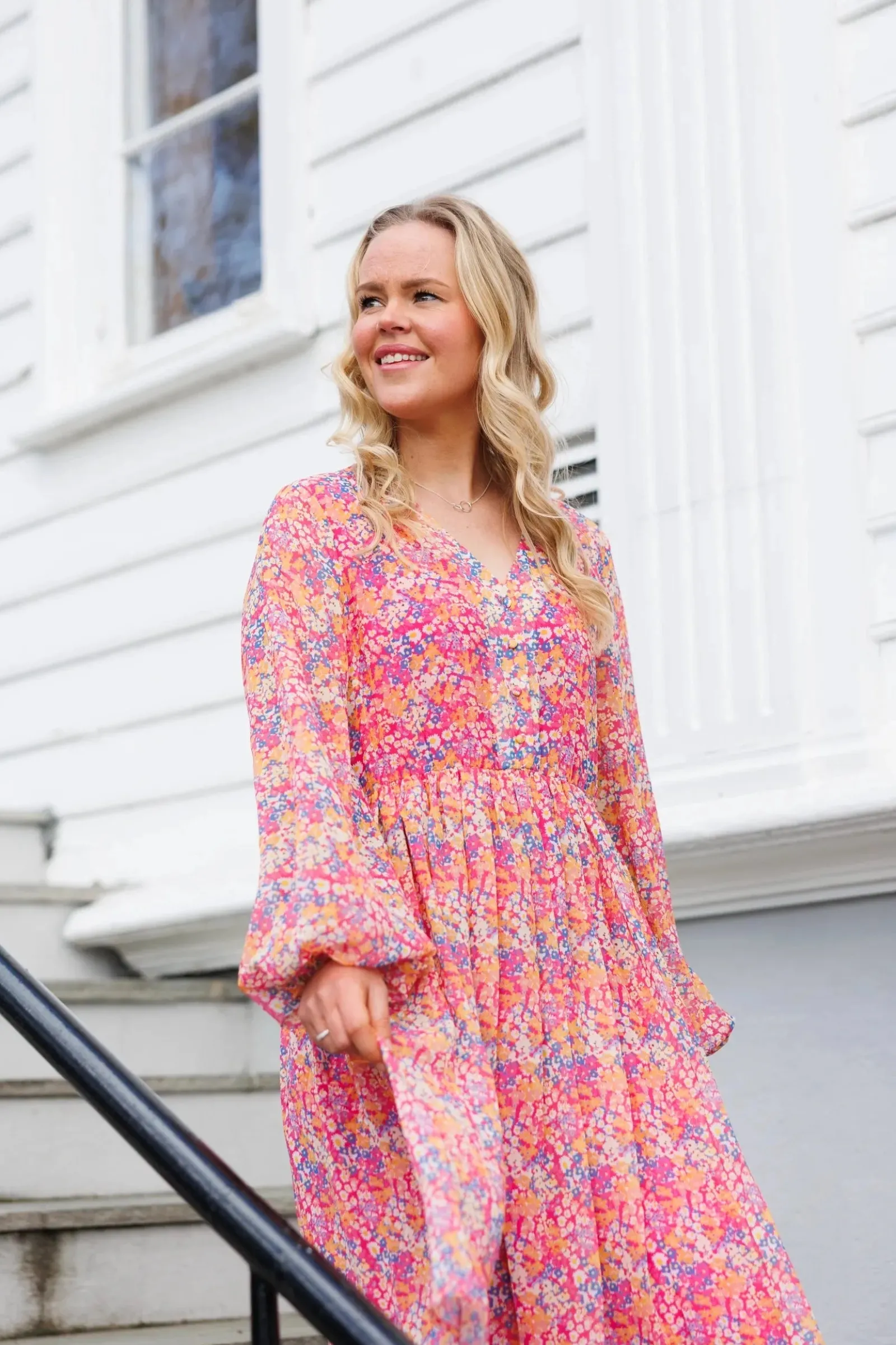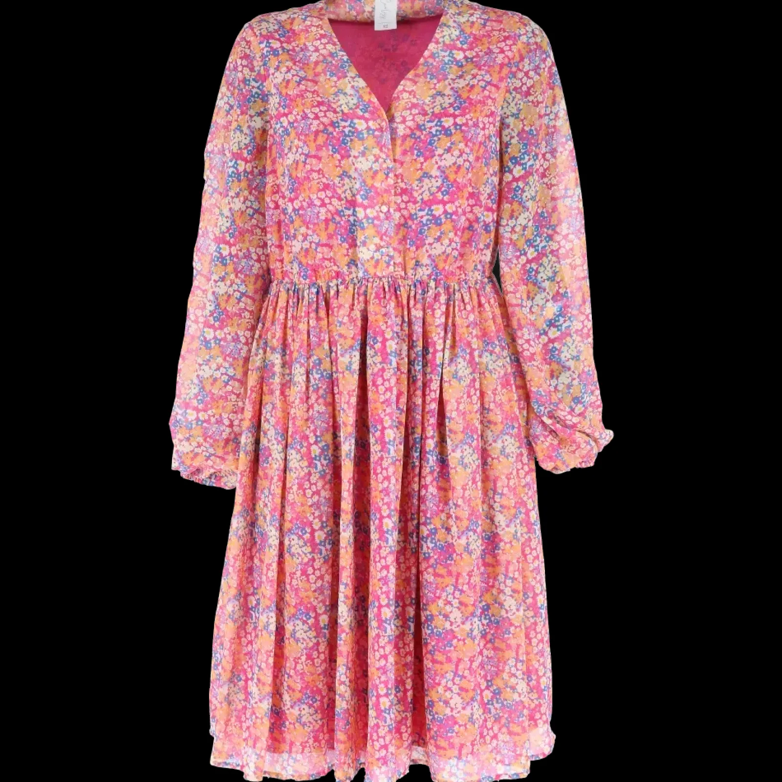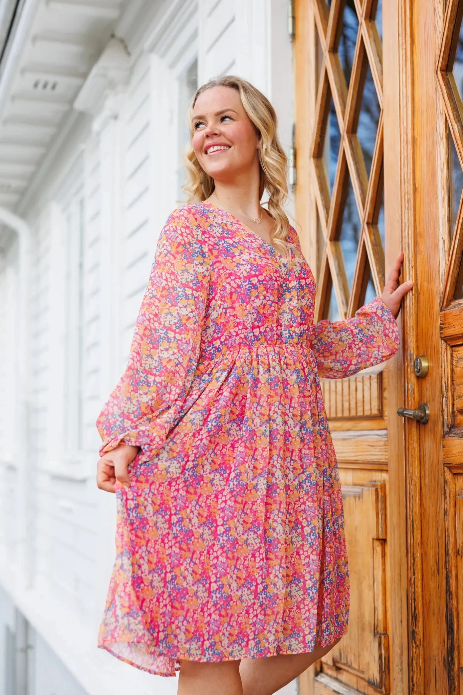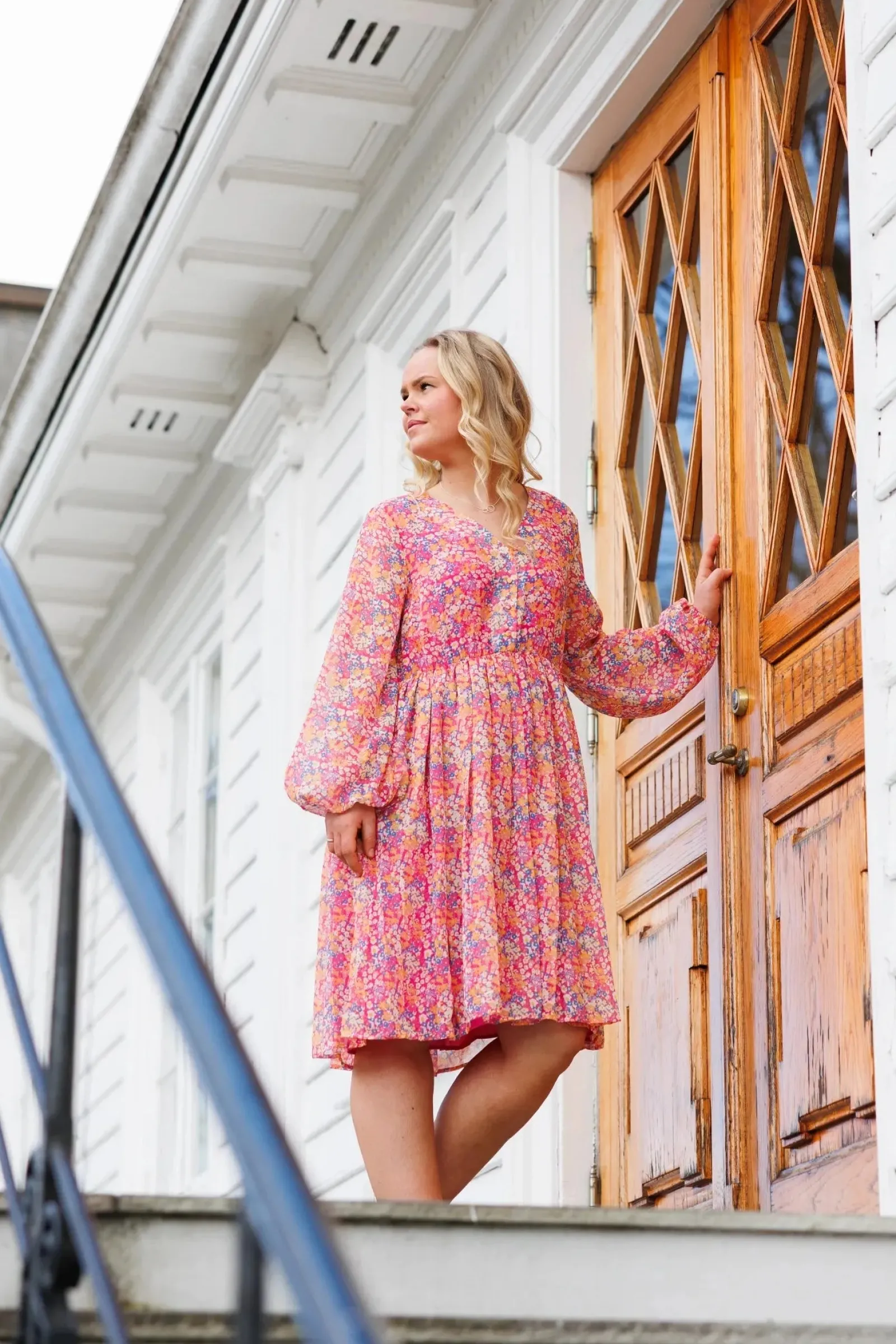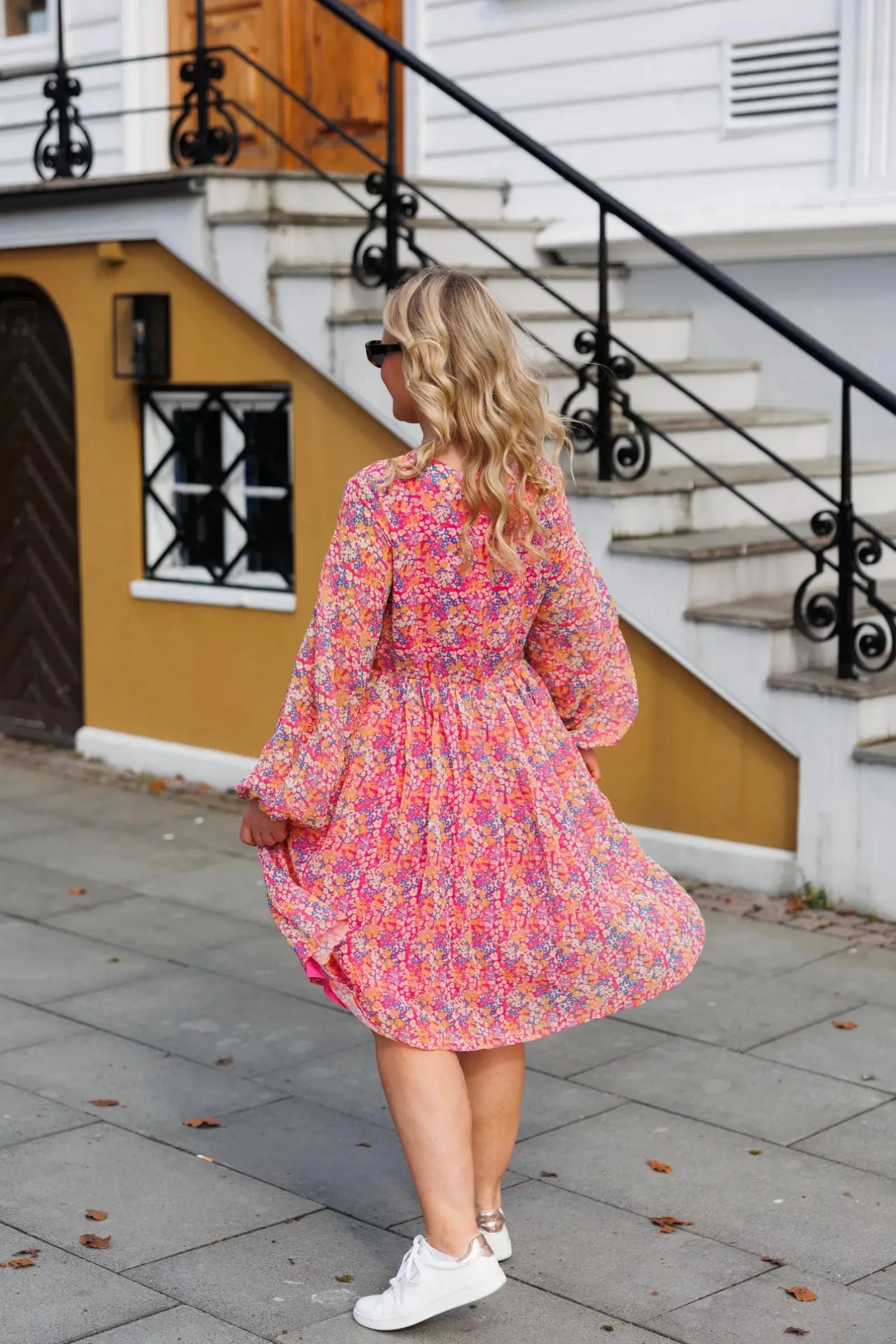 Den har lange ermer med lett puff og strikk ved håndleddene. Livet er markert med en lett rynket søm som gir volum og bevegelse til skjørtet. Kjolen har en V-utringning og knapper i front som kan åpnes/lukkes. Bianca er derfor super å feks amme i. Lengden går til under knærne. Det er lommer på hver side av hoftene. Stoffet er lett, luftig og passer så fint til vår og sommer.