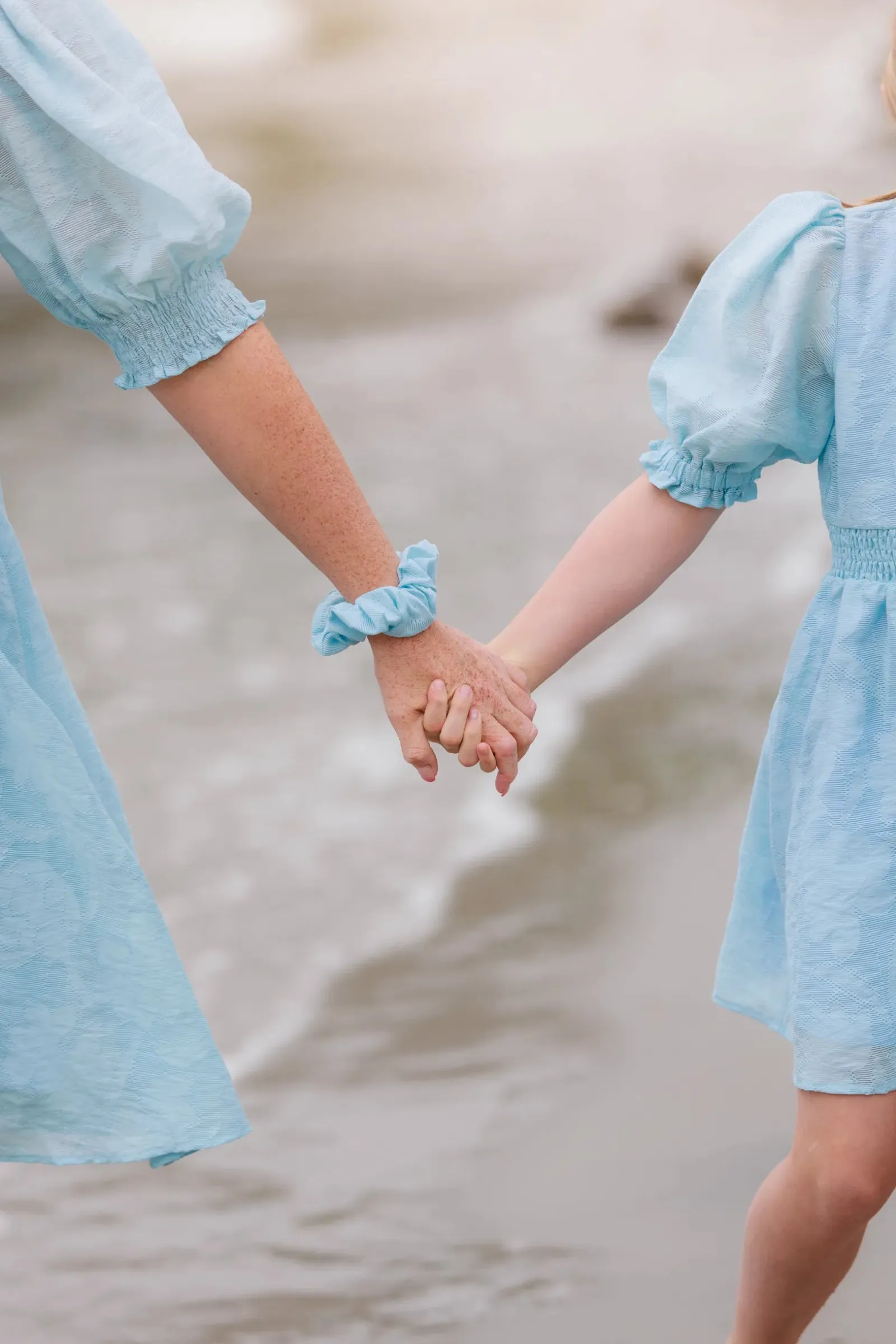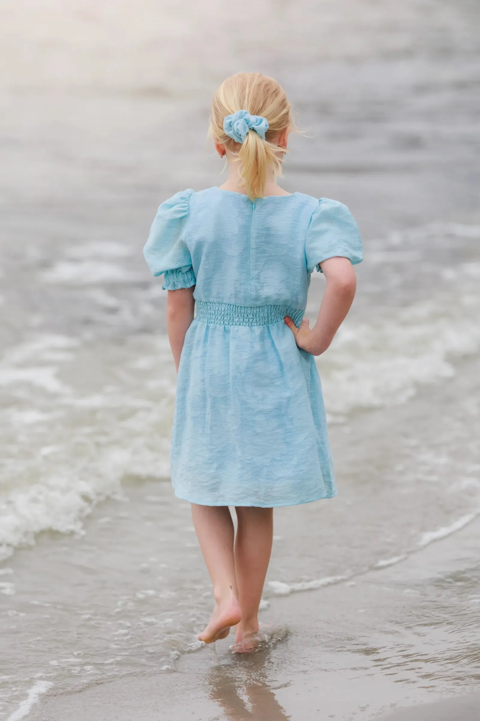 Flower Scrunchies 2pk i lyseblått er et nydelig hårstrikk med tekstur av blomster. Disse matcher perfekt med Belle Flower kjole i lang eller kort til dame, eller til barn.