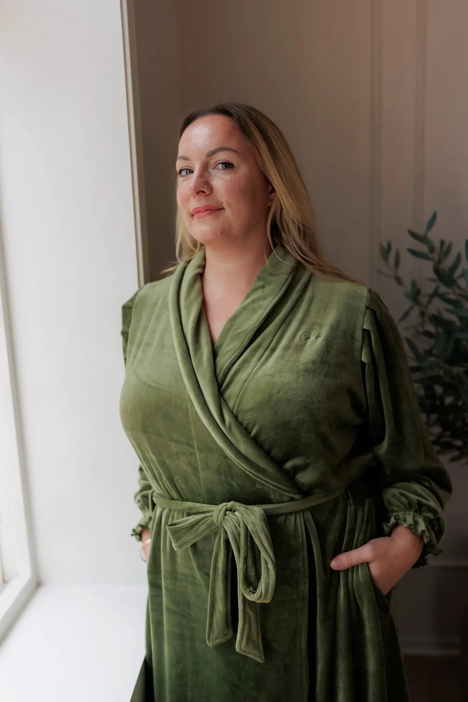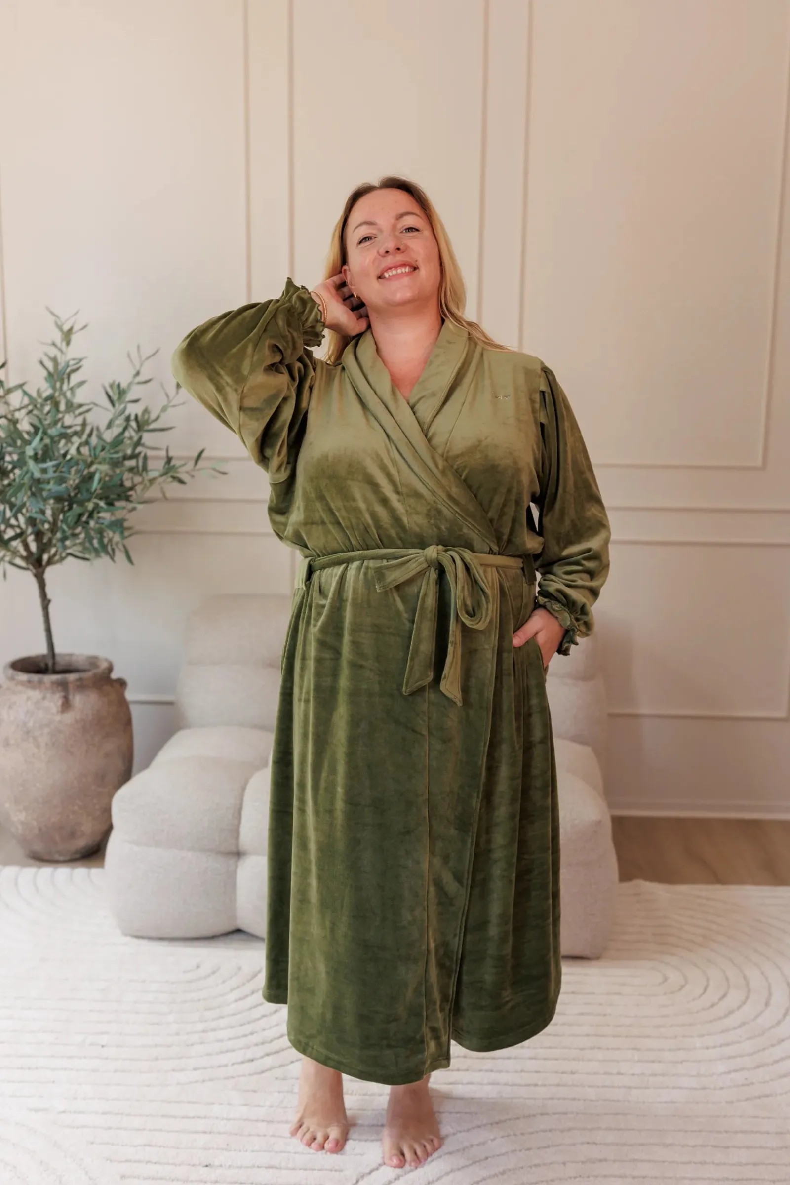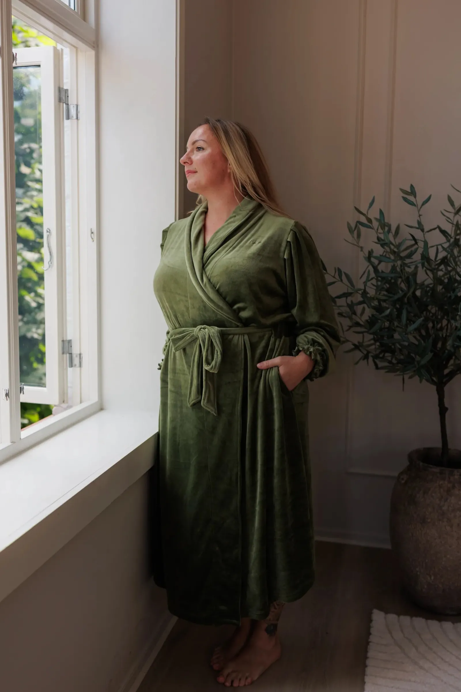 Det er belte i midjen og den har godelommer. Lengden er perfekt for at du kan bevege deg rundt på morgenen uten å være redd for at noen skal se deg.