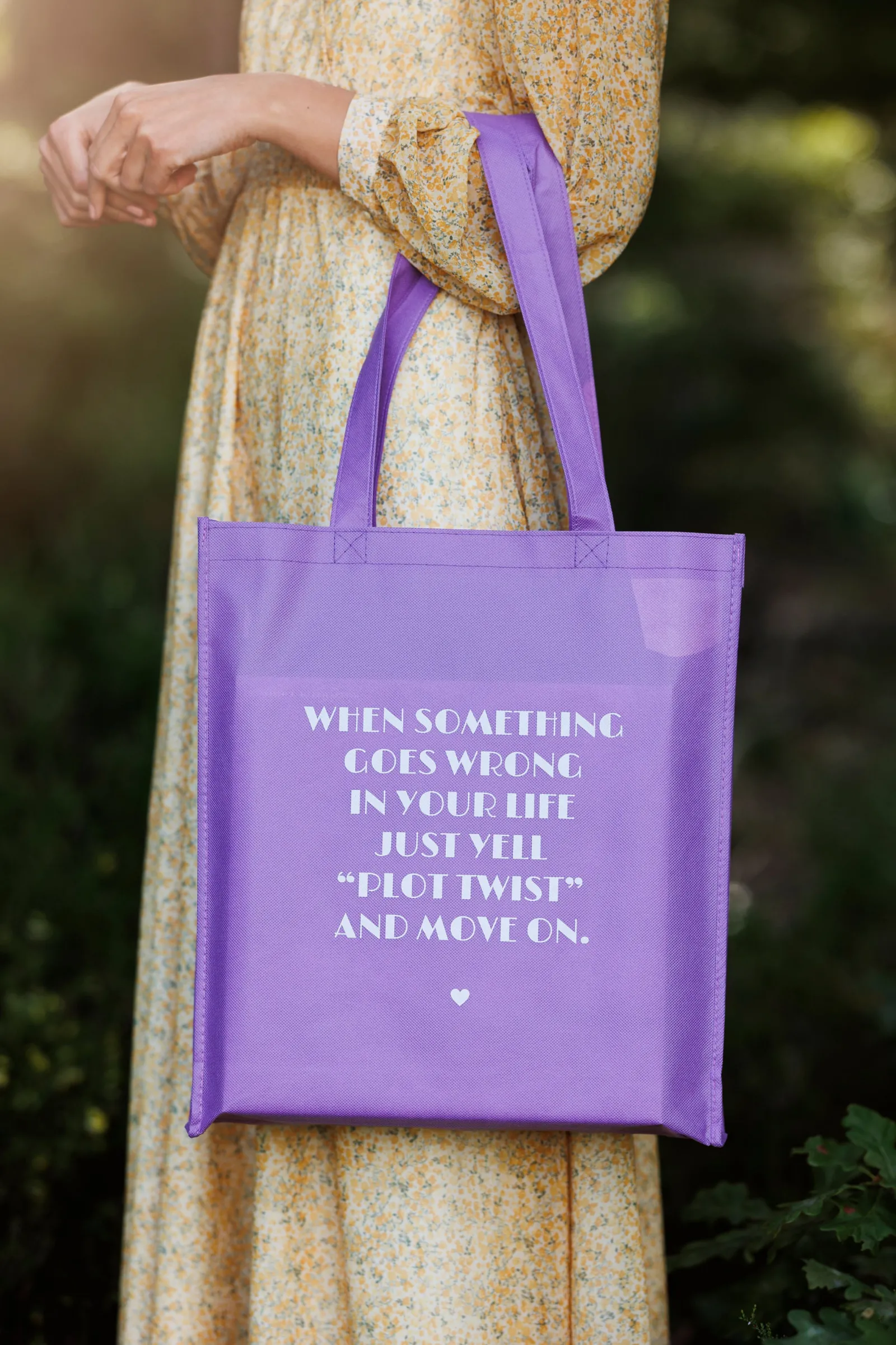 Med teksten «When something goes wrong in your life just yell «plot twist» and move on» på ene siden og logo på andre.