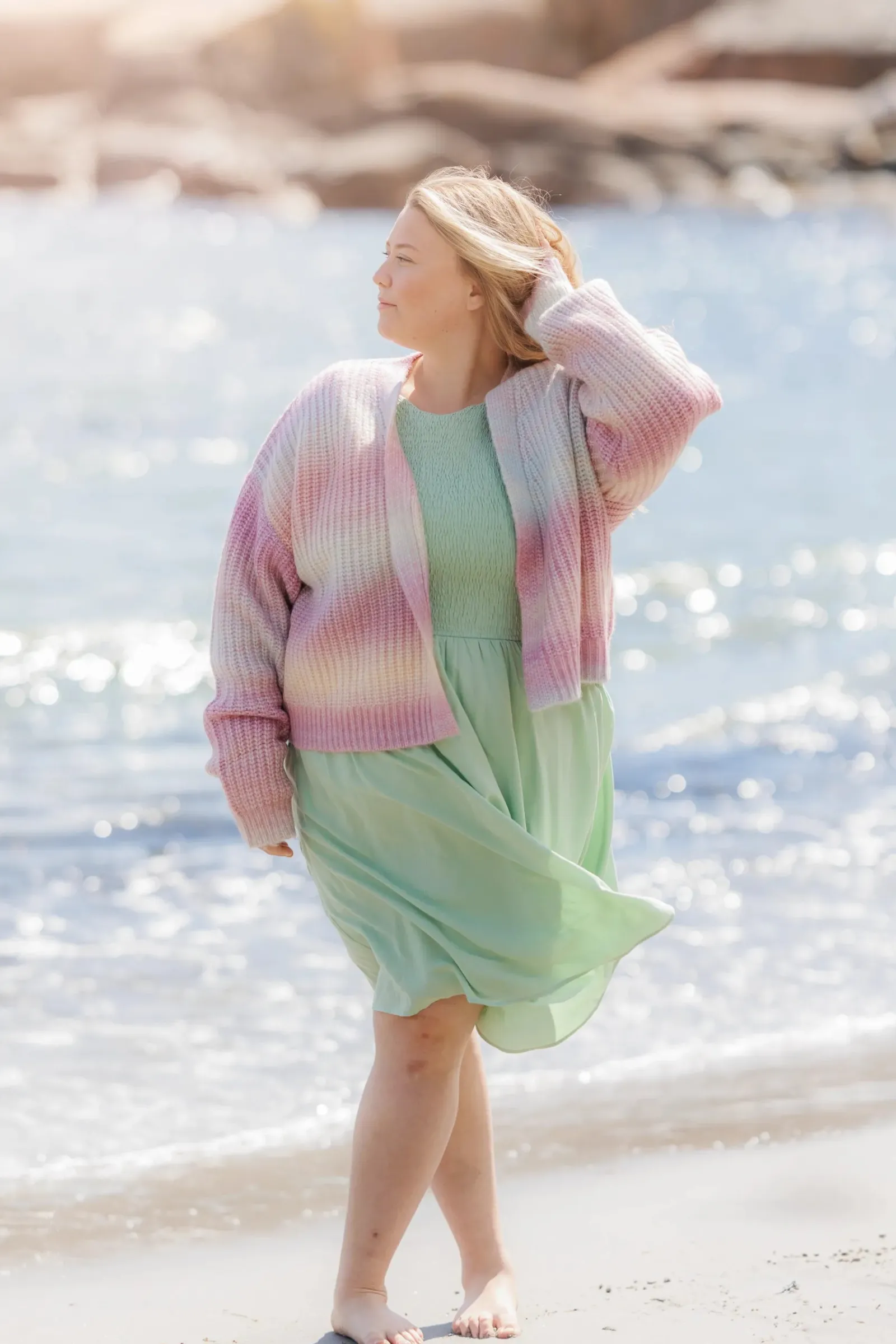 Leah cardigan i pastell er perfekt å slenge over en kjole eller andre plagg. Den er strikket med nydelige fargede striper og har en løs passform. Stopper rett over midjen og er uten knapper eller glidelås.