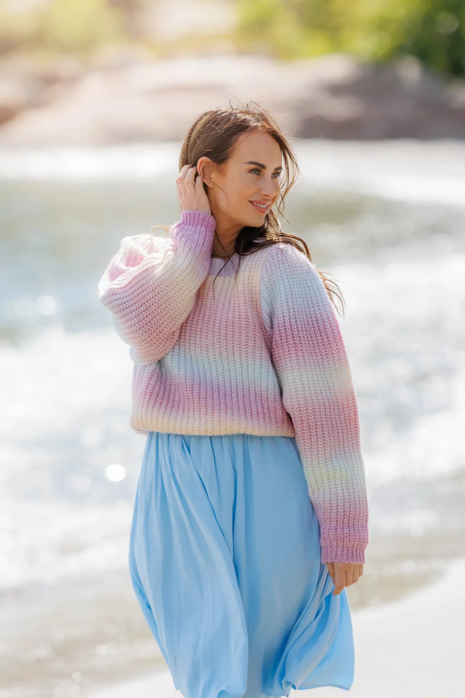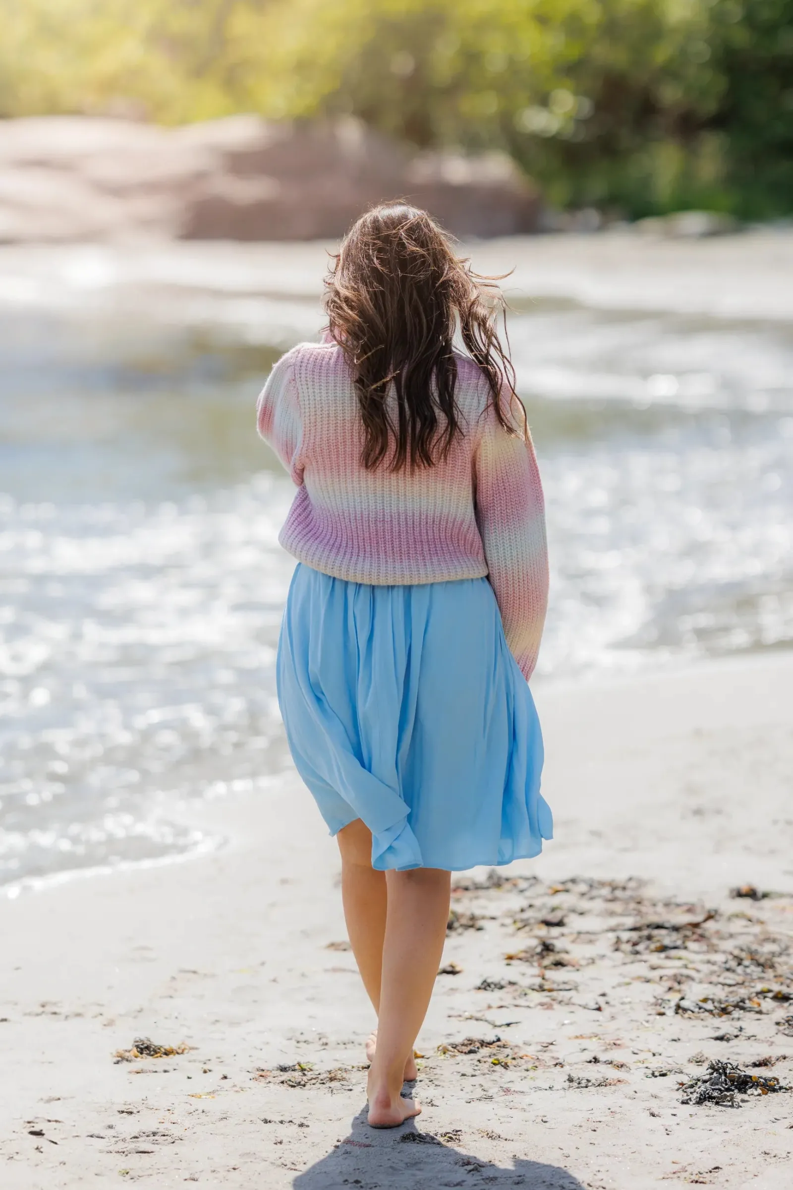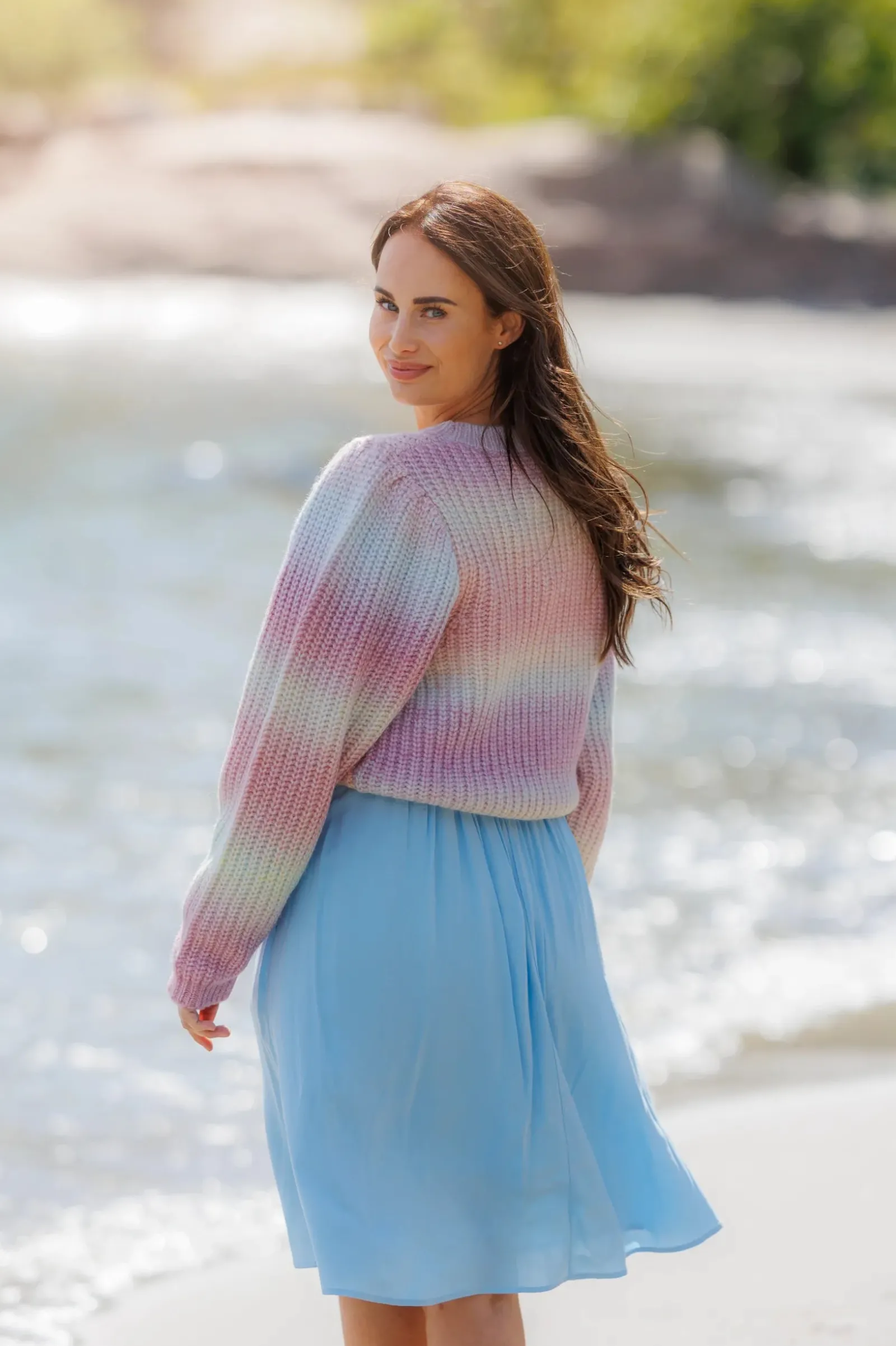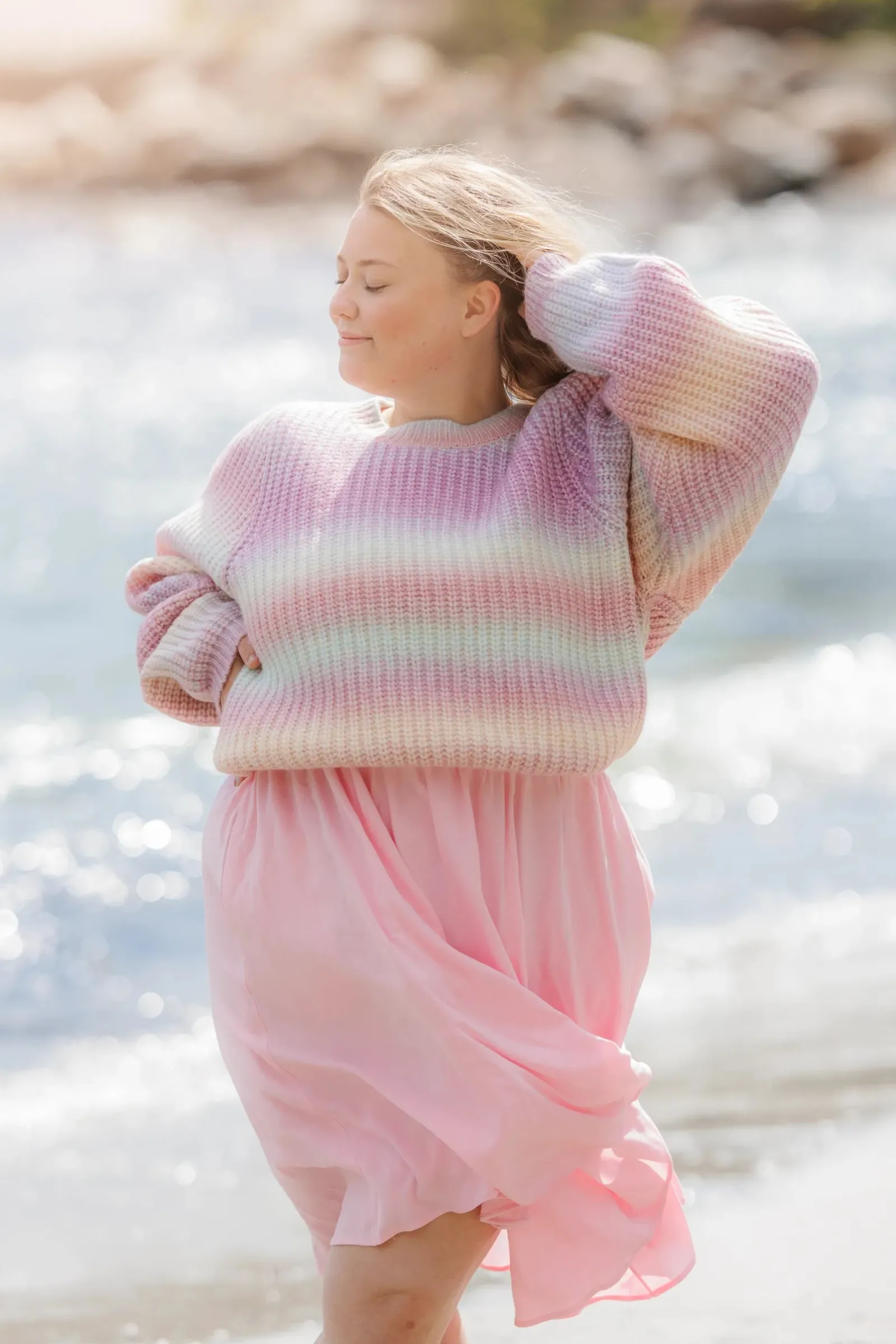 Leah genser i pastell er perfekt å slenge over en kjole eller andre plagg. Den er strikket med delikat stripemønster og har en løs passform. Kan strammes inn i midjen med skjult knyting så du enkelt kan justere lengden.
