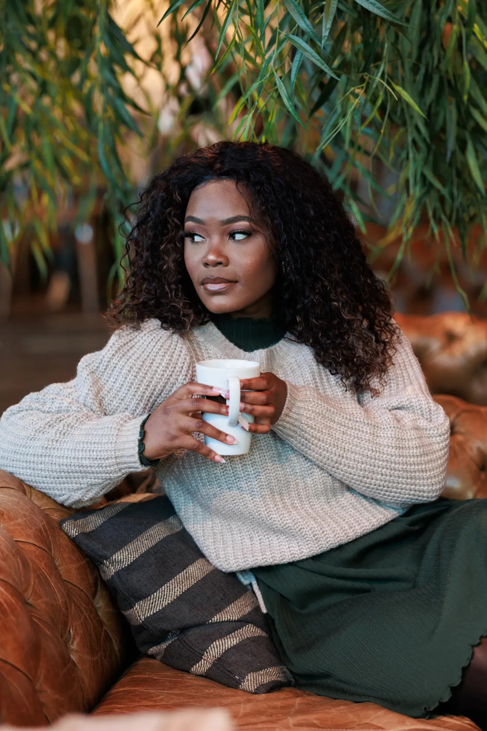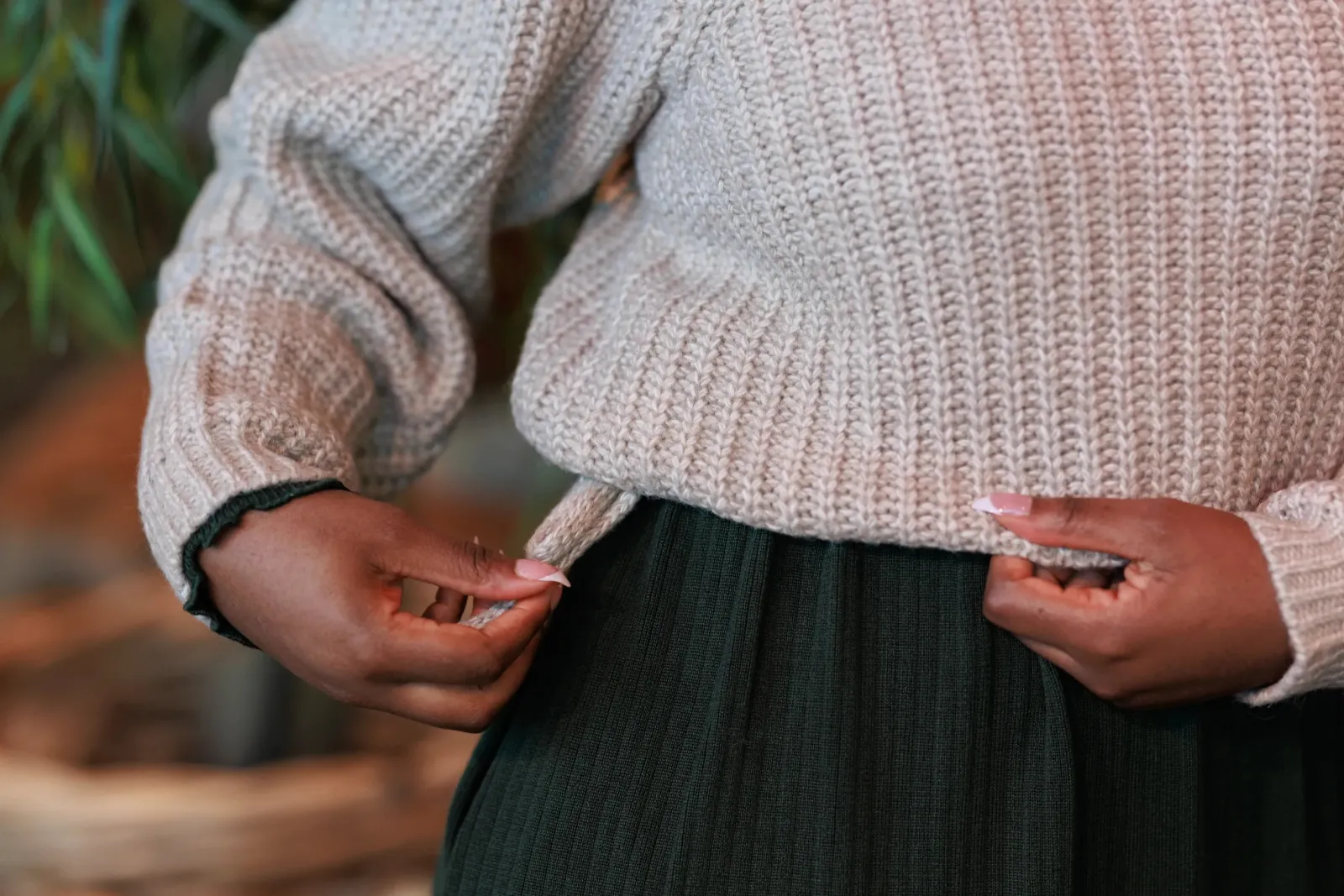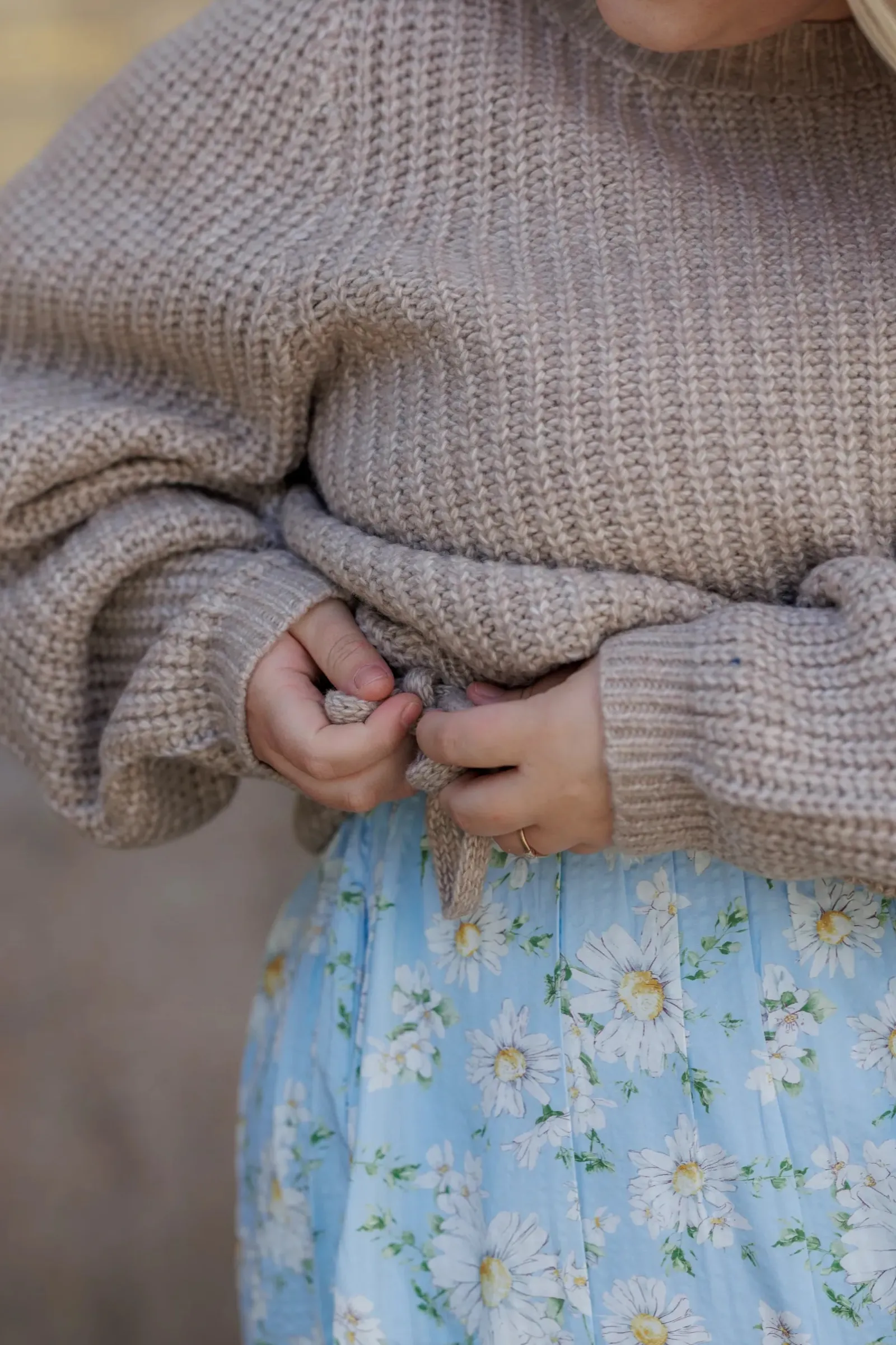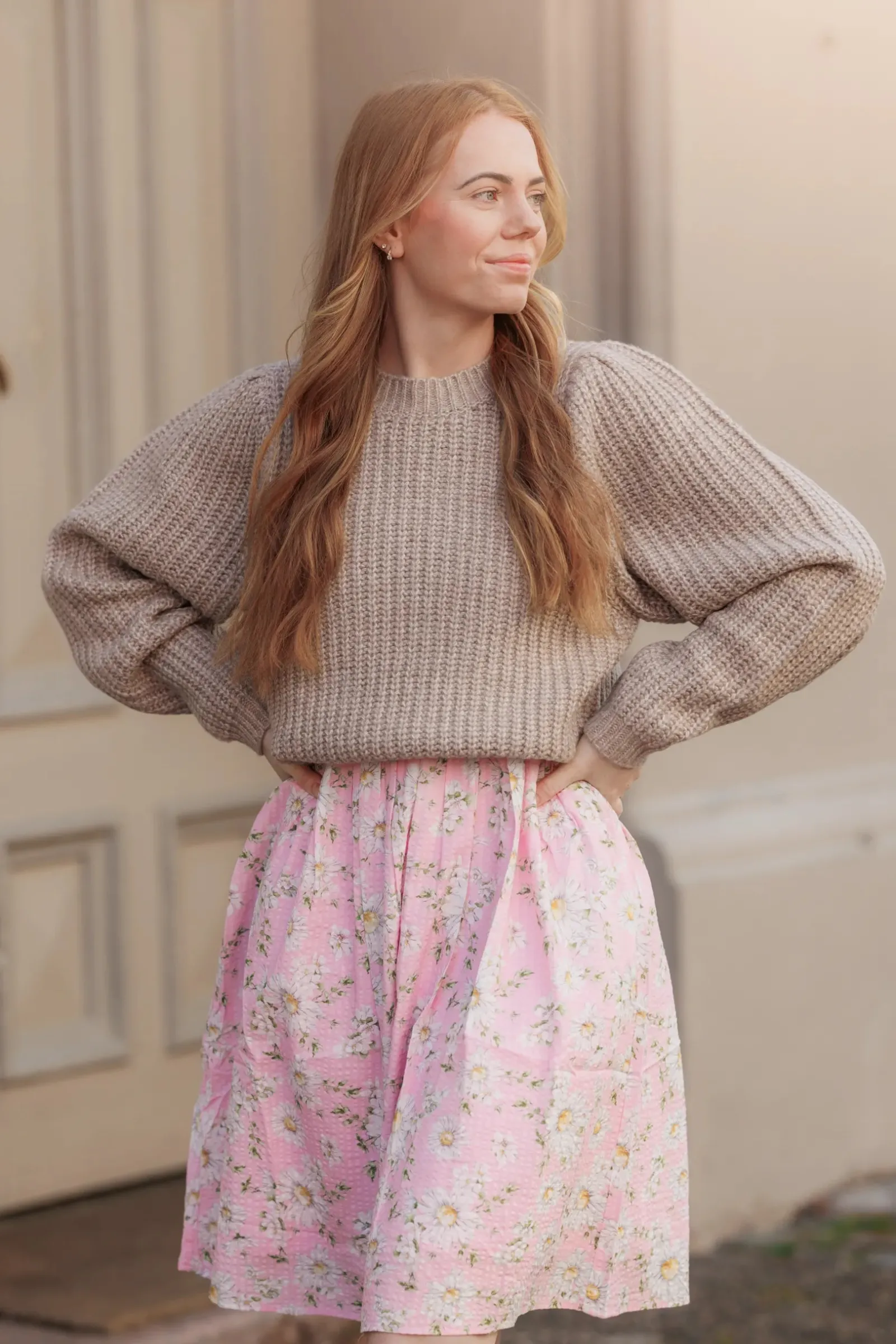 Leah genser i beige er perfekt å slenge over en kjole eller andre plagg. Den er strikket med delikat stripemønster og har en løs passform. Kan strammes inn i midjen med skjult knyting så du enkelt kan justere lengden.