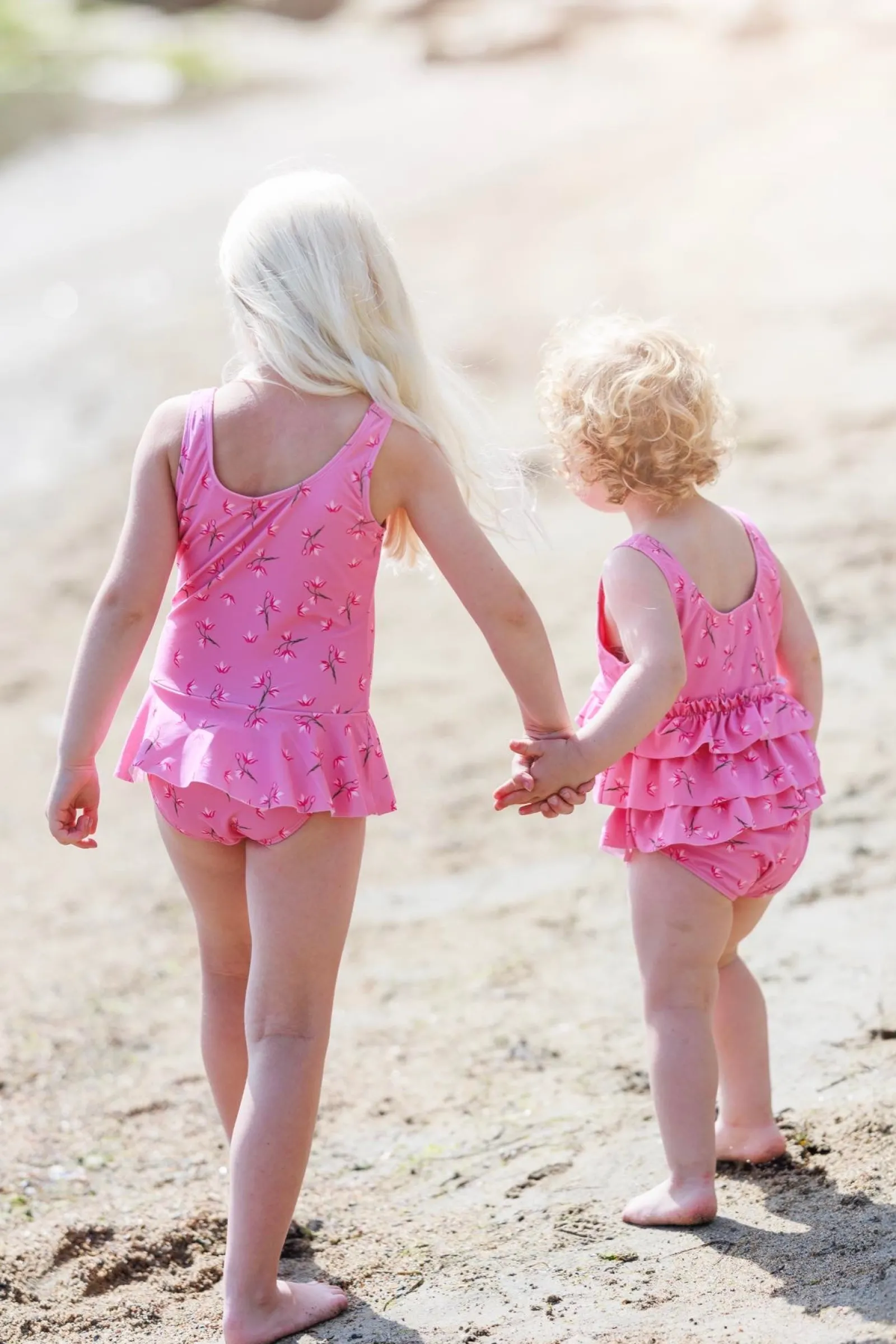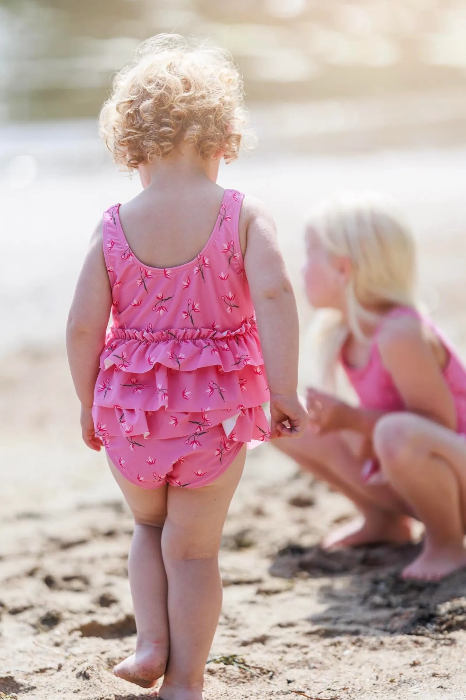 Bikini til barn i topp og truse i blomstrete print. Den har fine volanger rundt mage og hofter.