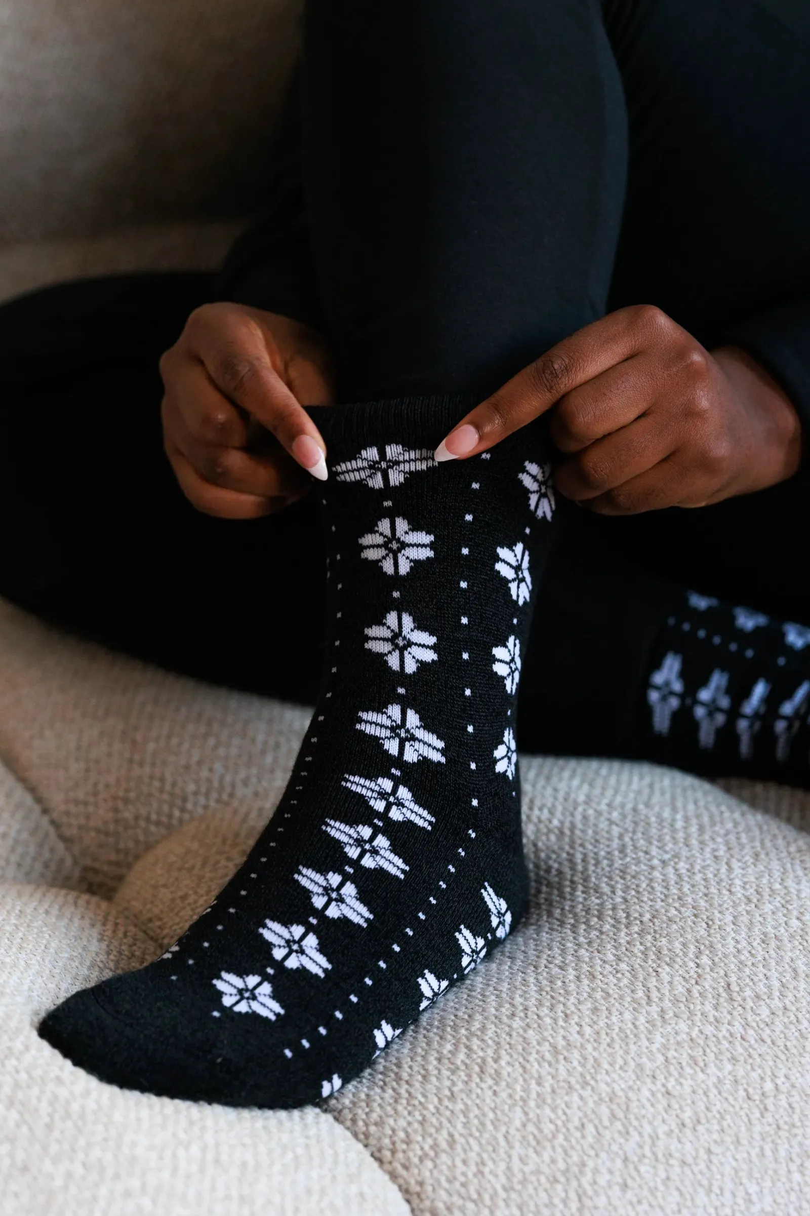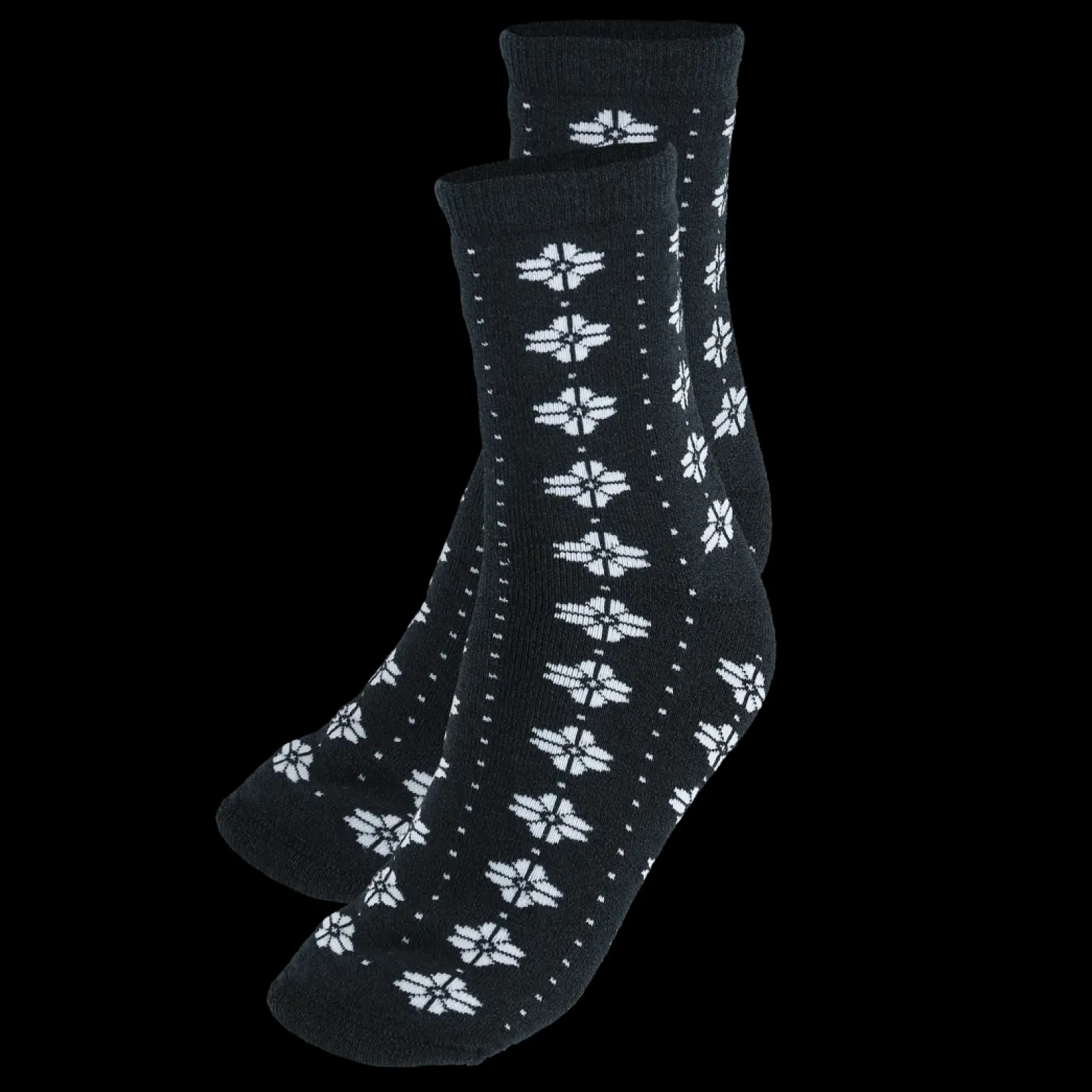 Disse sokkene er svarte med et hvitt mønster inspirert av vinter og snø. Laget av en herlig blanding av ull og viskose av bambus, så om du leter etter varme og behagelige sokker til vinteren er disse perfekt for deg.