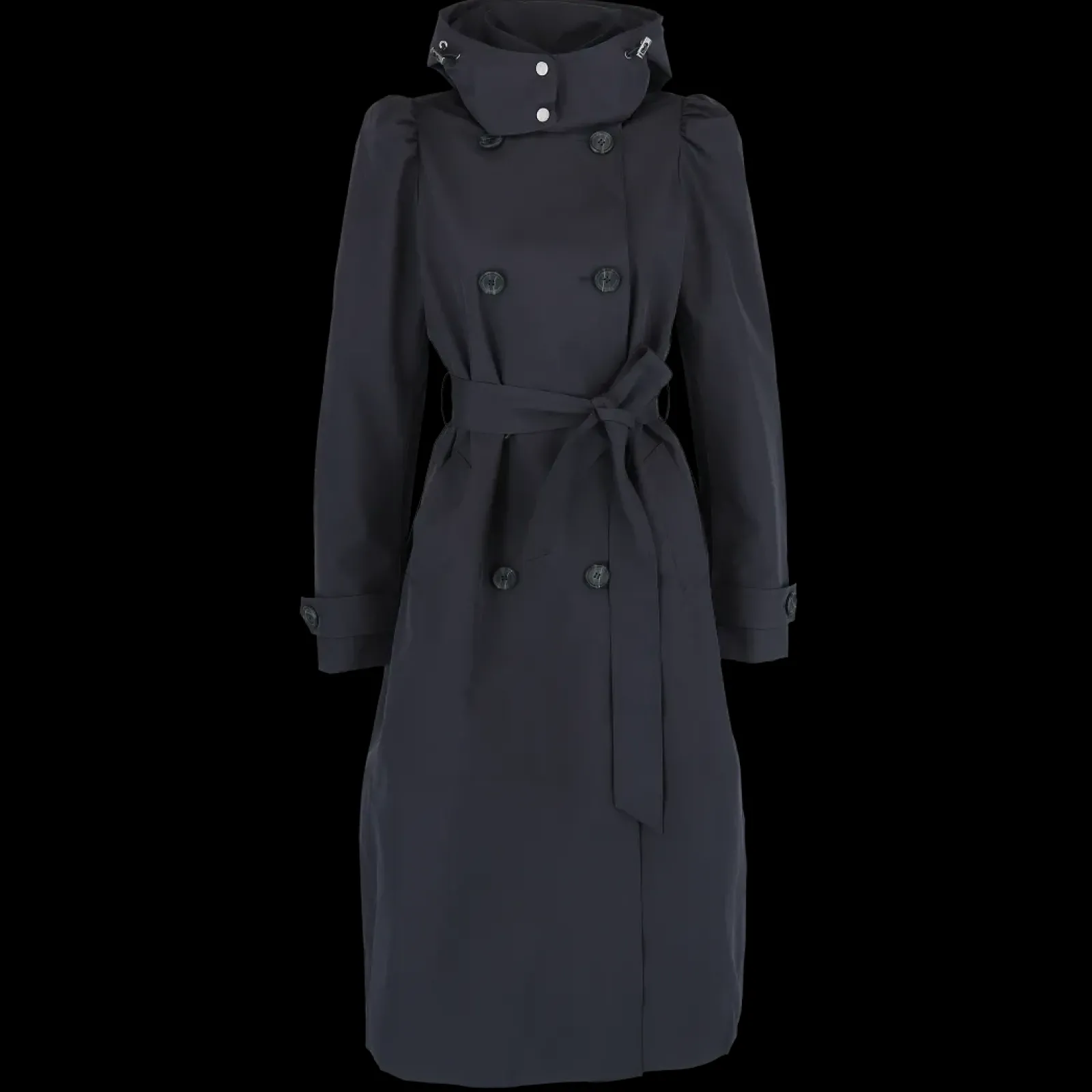 Den er dobbeltspent med knytebelte i midjen. Høy krage og justerbar hette for ekstra skjerming for regn og vind. Volum på skuldrene for en feminin touch.