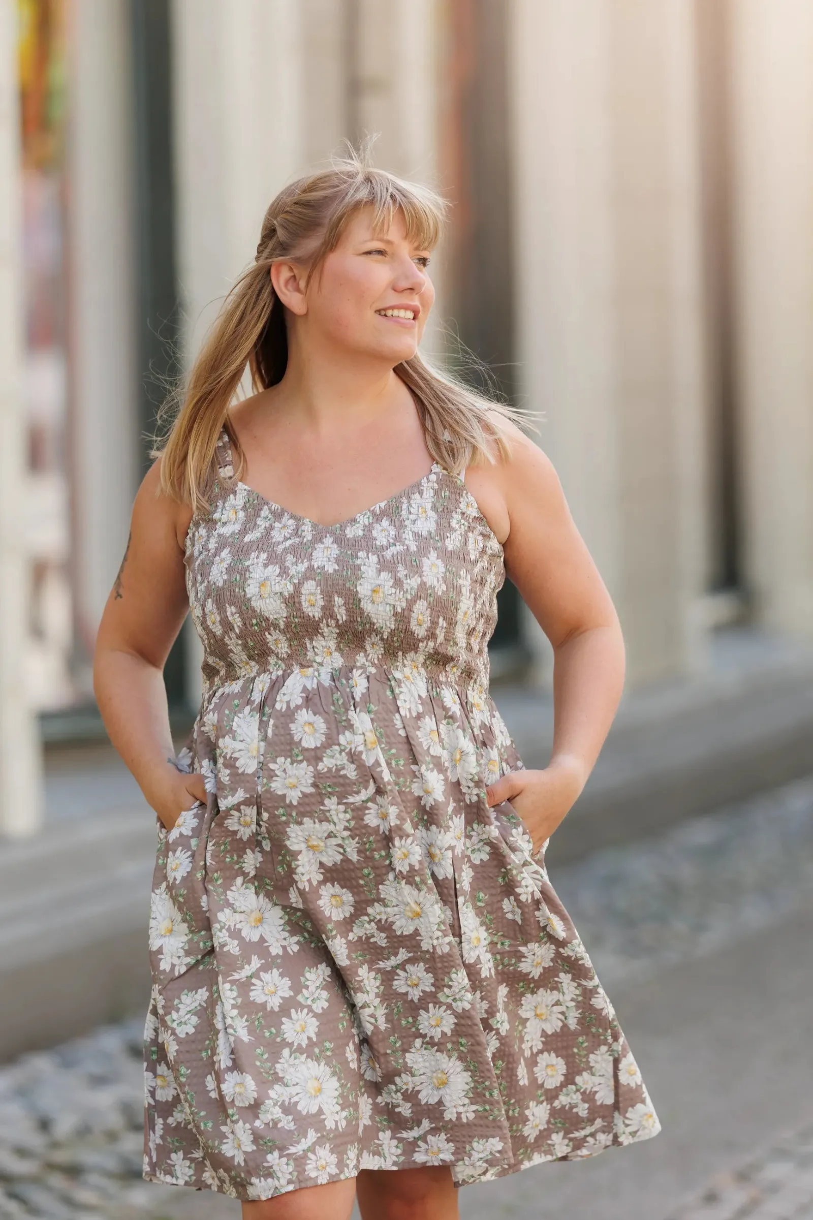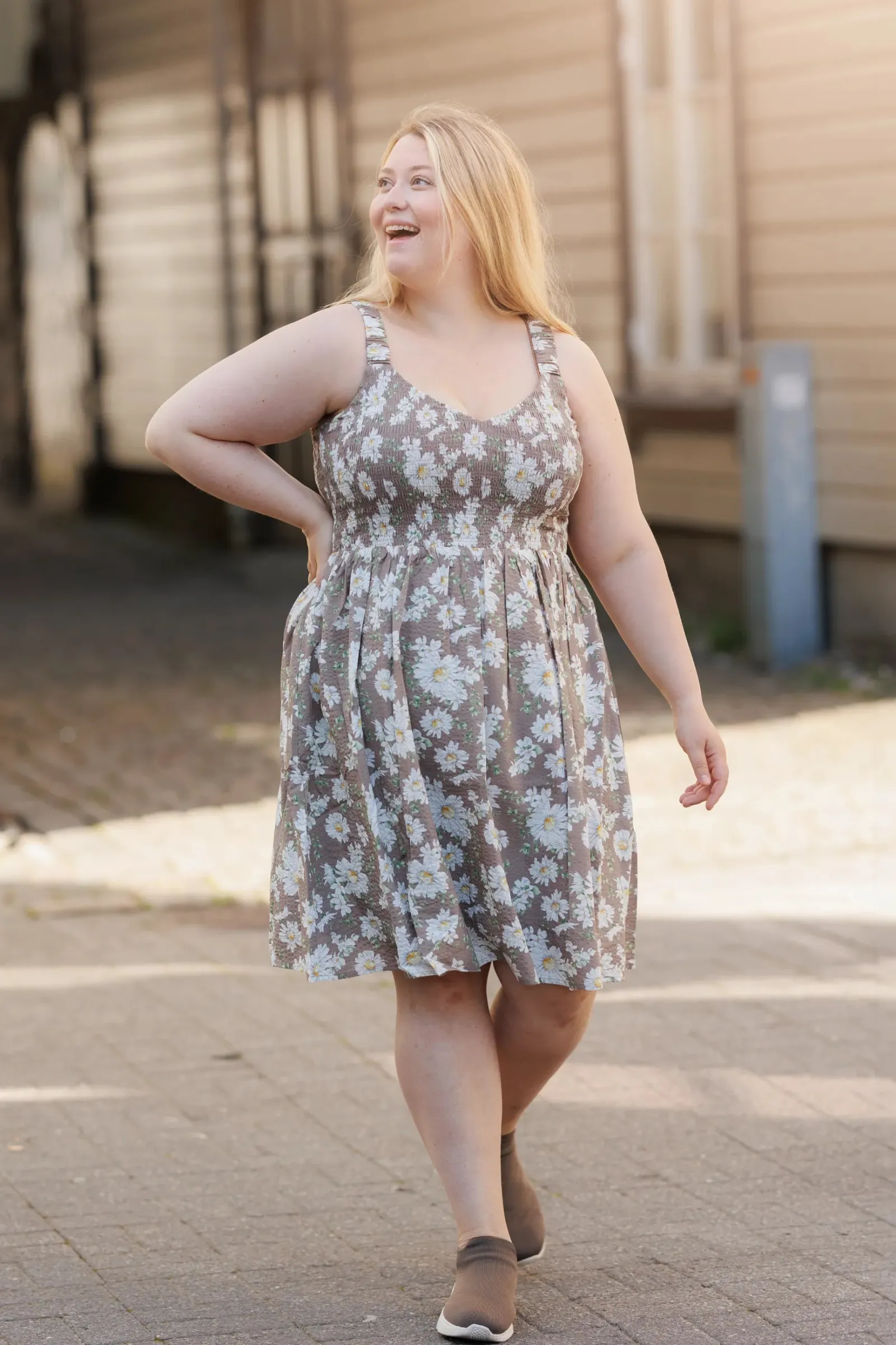 Vera er en sommerlig og feminin kjole. Den har et beige stoff med et delikat blomstermønster. Kjolen har brede stropper og et smockliv som gir en komfortabel og flatterende passform. Skjørtet er lett og luftig, faller i myke folder og rekker til rett over knærne. Dette gjør kjolen ideell for varme sommerdager, og den har også lommer som gir et praktisk og avslappet preg.