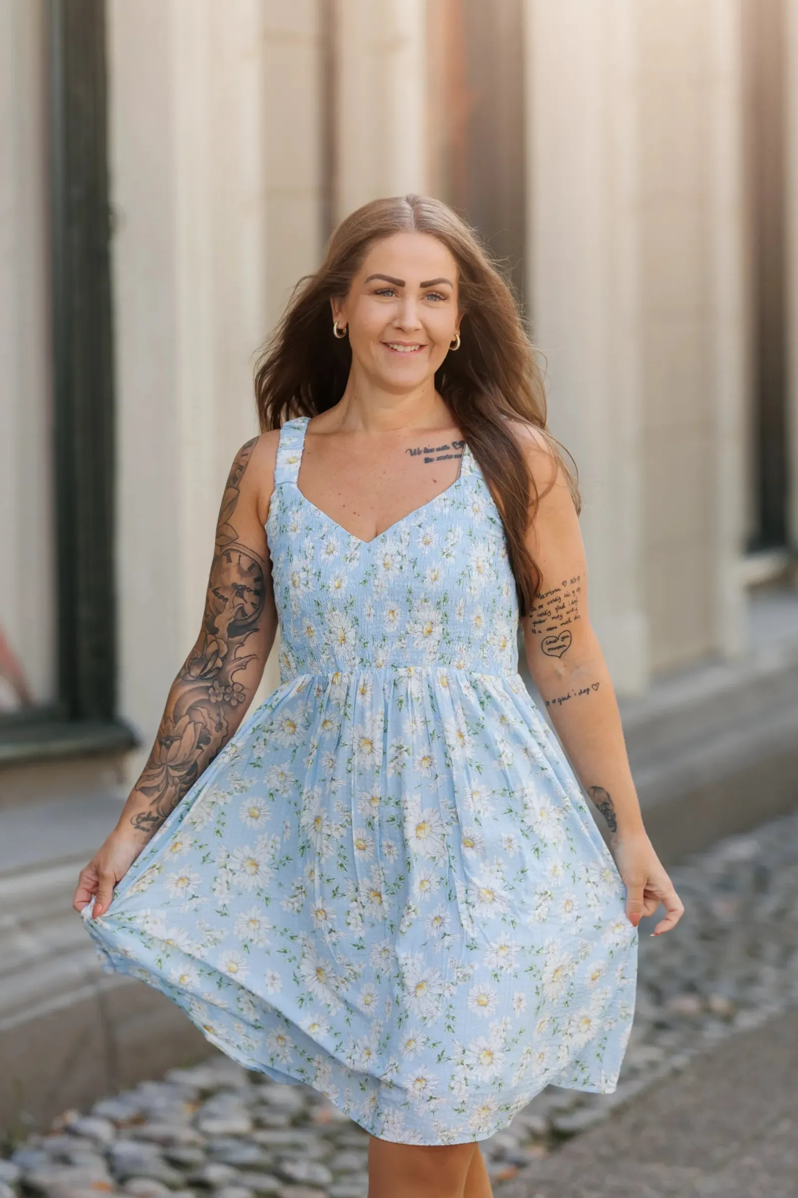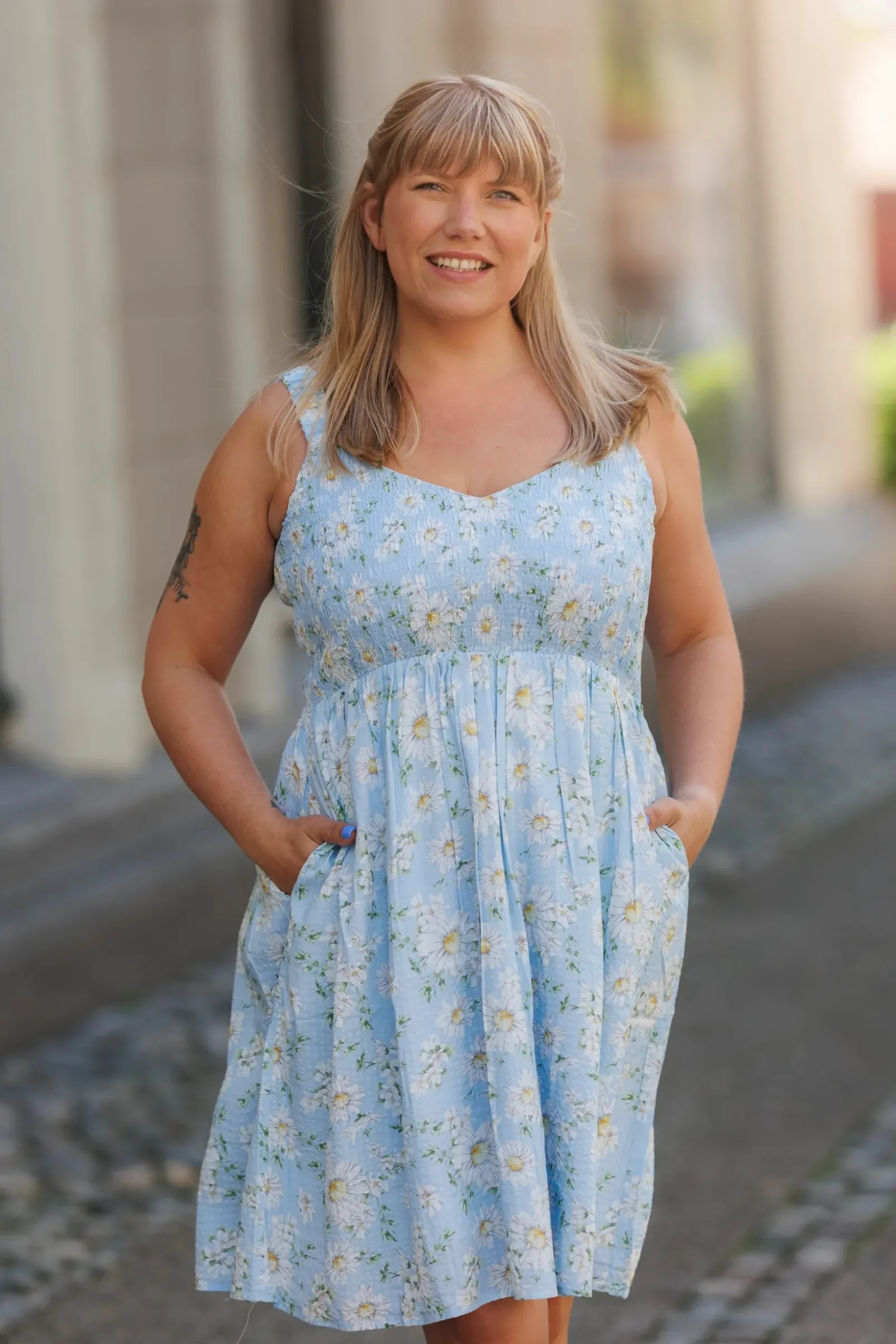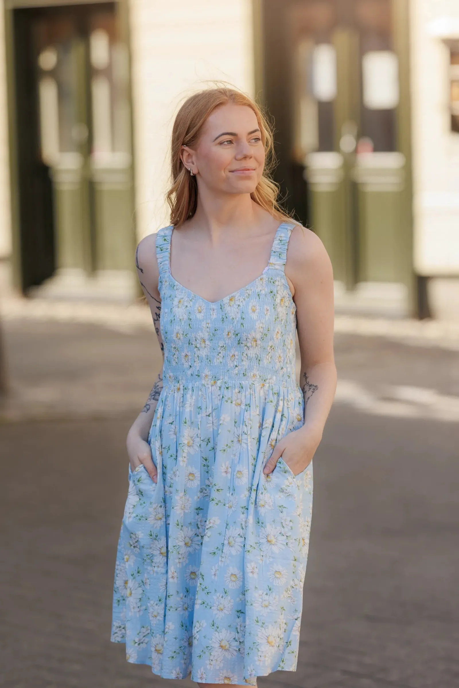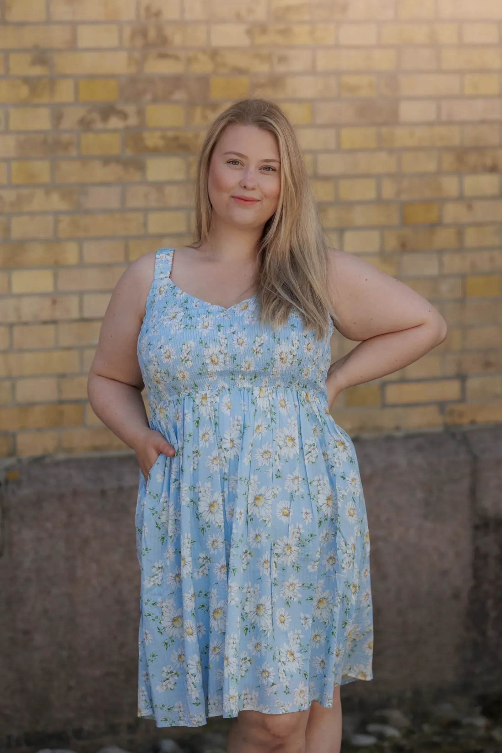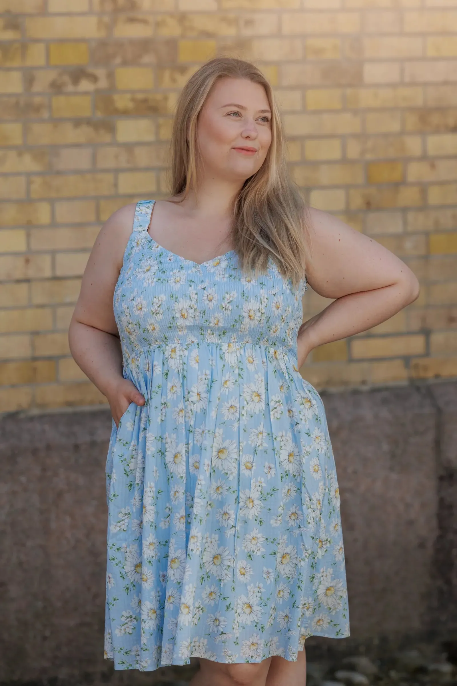 Vera er en sommerlig og feminin kjole. Den har et lyseblått stoff med et delikat blomstermønster. Kjolen har brede stropper og et smockliv som gir en komfortabel og flatterende passform. Skjørtet er lett og luftig, faller i myke folder og rekker til rett over knærne. Dette gjør kjolen ideell for varme sommerdager, og den har også lommer som gir et praktisk og avslappet preg.